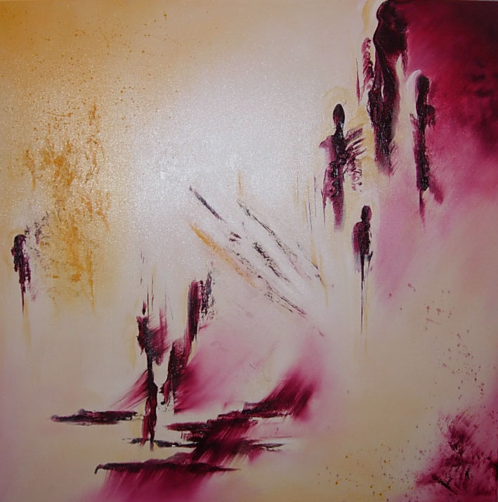 Japanse tuin is een olieverf schilderij op bespannen doek. Het toont een abstract beeld van figuren in een Japanse tuin.