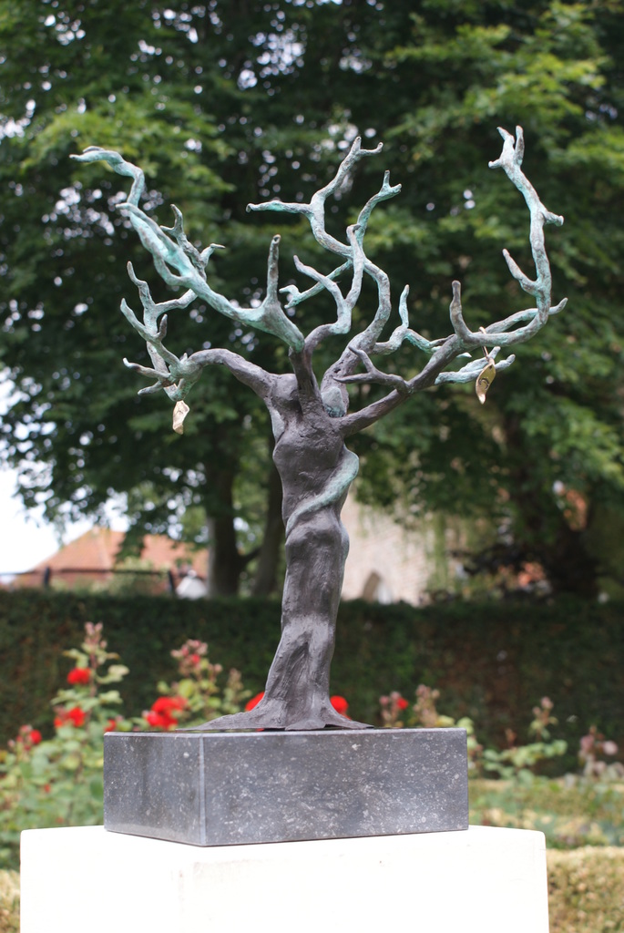 Opdracht voor 25-jarig huwelijk, levensboom ‘Roots’, twee lichamen in stam verstrengeld, uitlopend in vier vertakkingen. Twee goudkleurige blaadjes met inscriptie van dochters hangen aan de boom. Liefde, leven, geborgenheid en intimiteit. Huwelijkscadeau.