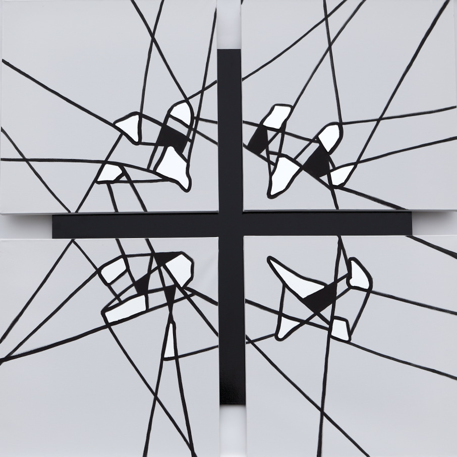 wit/zwart reflectie 4 doeken op paneel,acrylverf met stukjes spiegel.