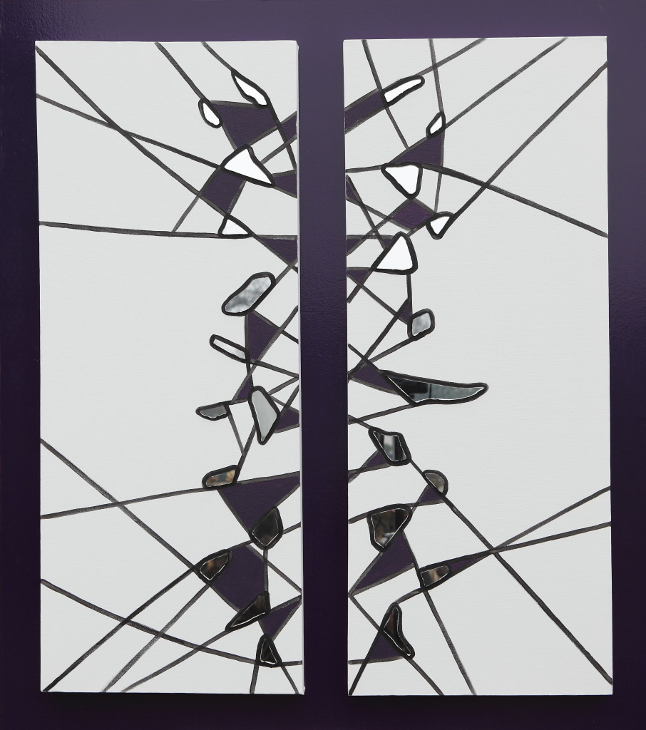 paars wit doek op paneel met stukjes spiegel verwerkt.
