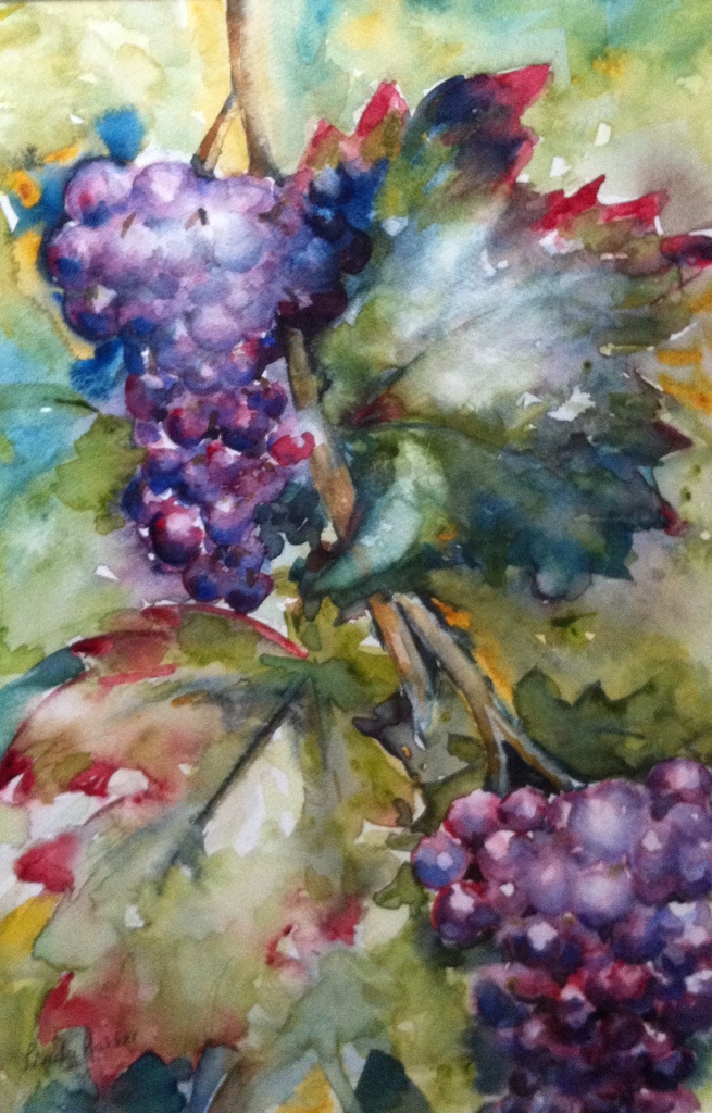 Tweede deel van een tweeluik. Samen 425 Euro in bankhouten lijsten met passepartouts Prachtig kleurend blad. En op het moment dat die bijna afvallen zijn daar de vruchten: Druiven om te eten. Of om te bewaren als wijn. Vruchten blijven bestaan. Het gaat door. Leven eindigt niet.