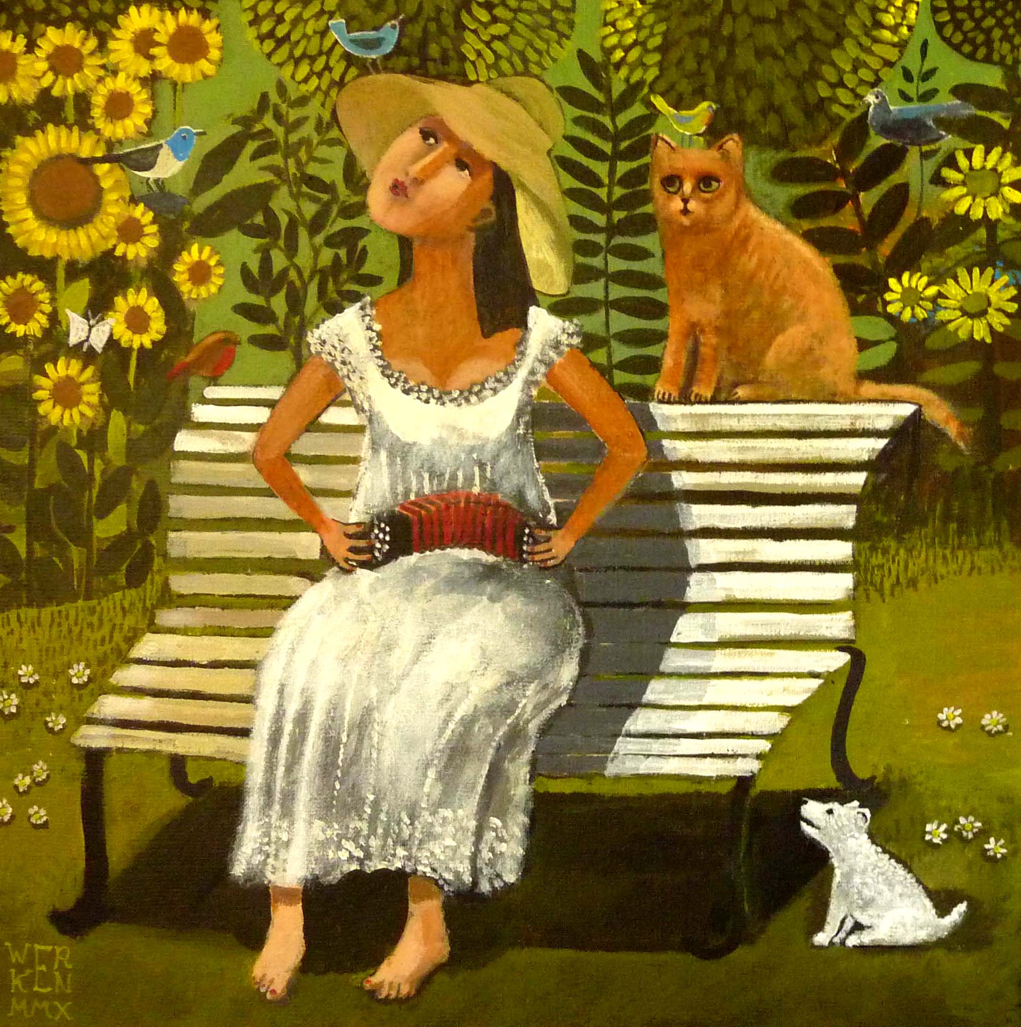 Vogel Bloemen Tuin Bank Poes Zomer Zonnebloemen Hondje Naief Illustratief