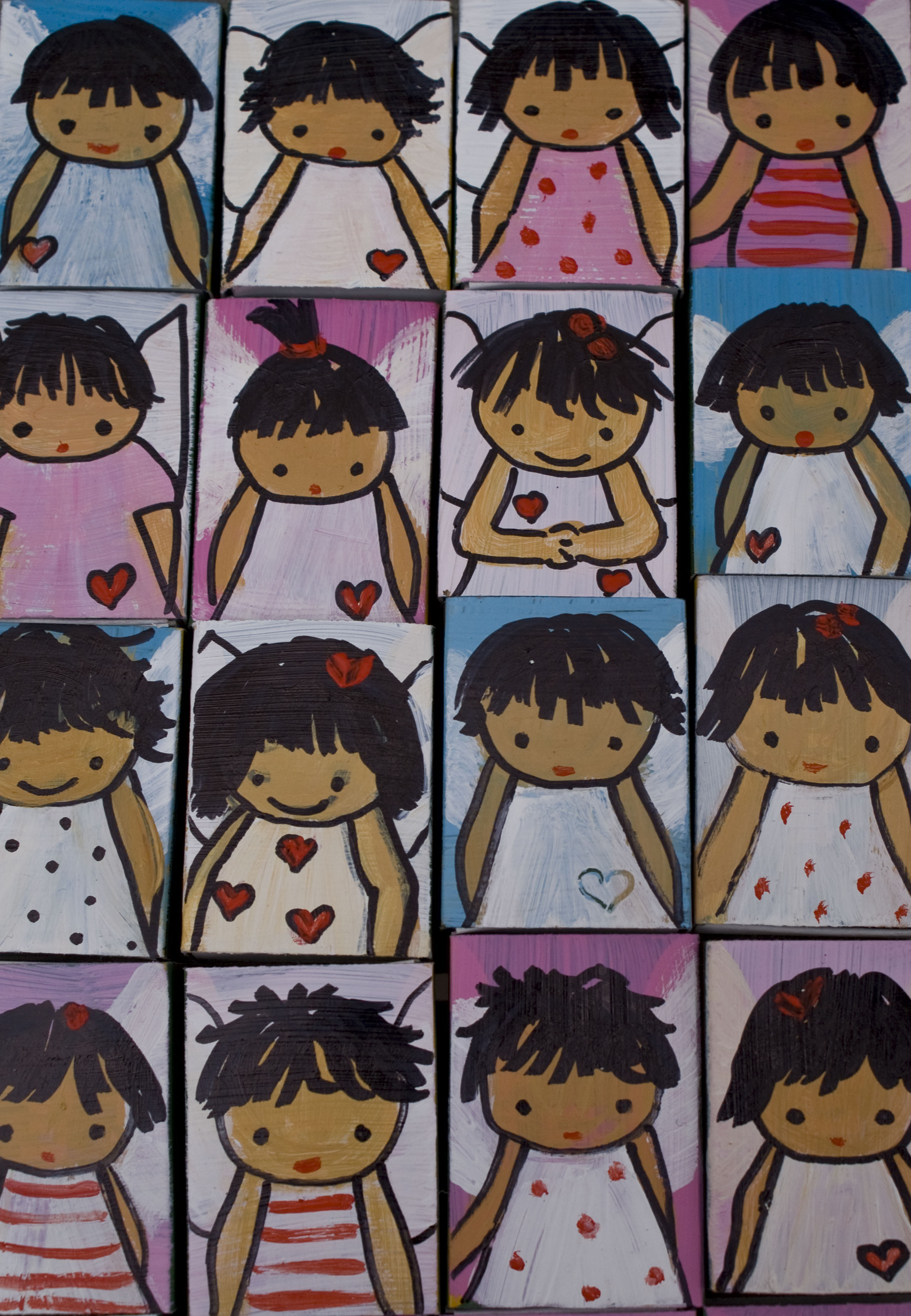 Vele kleine lucifersdoosjes waar engelen op geschilderd zijn.samen gevoegd en gefotografeerd