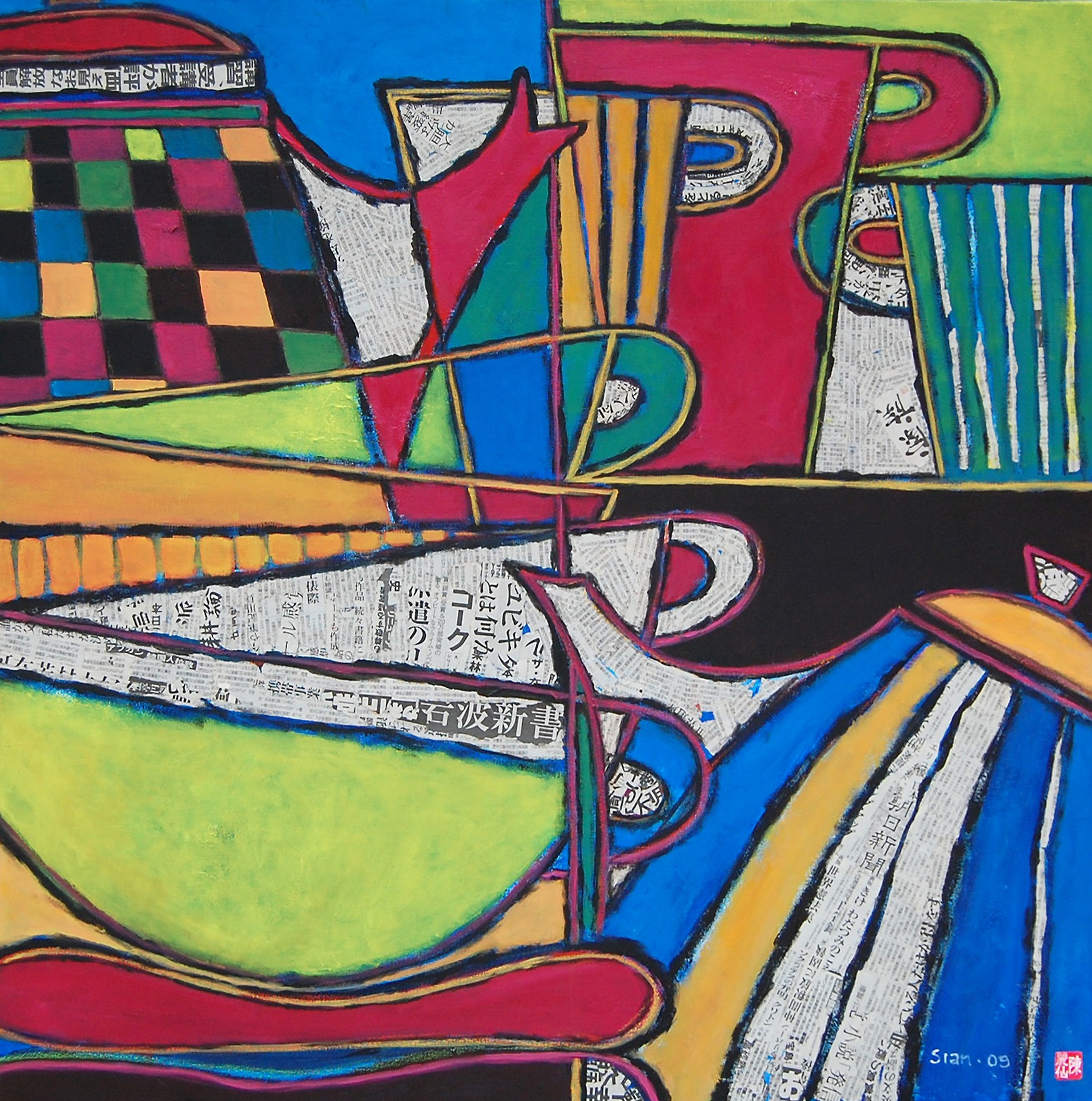 Kopjes, koffie-en theepotten geabstraheerd tot lijnen- en vlakkenspel. Acryl/collage op linnen. Nu te bezichtigen bij Galerie Storm, Amsterdam.