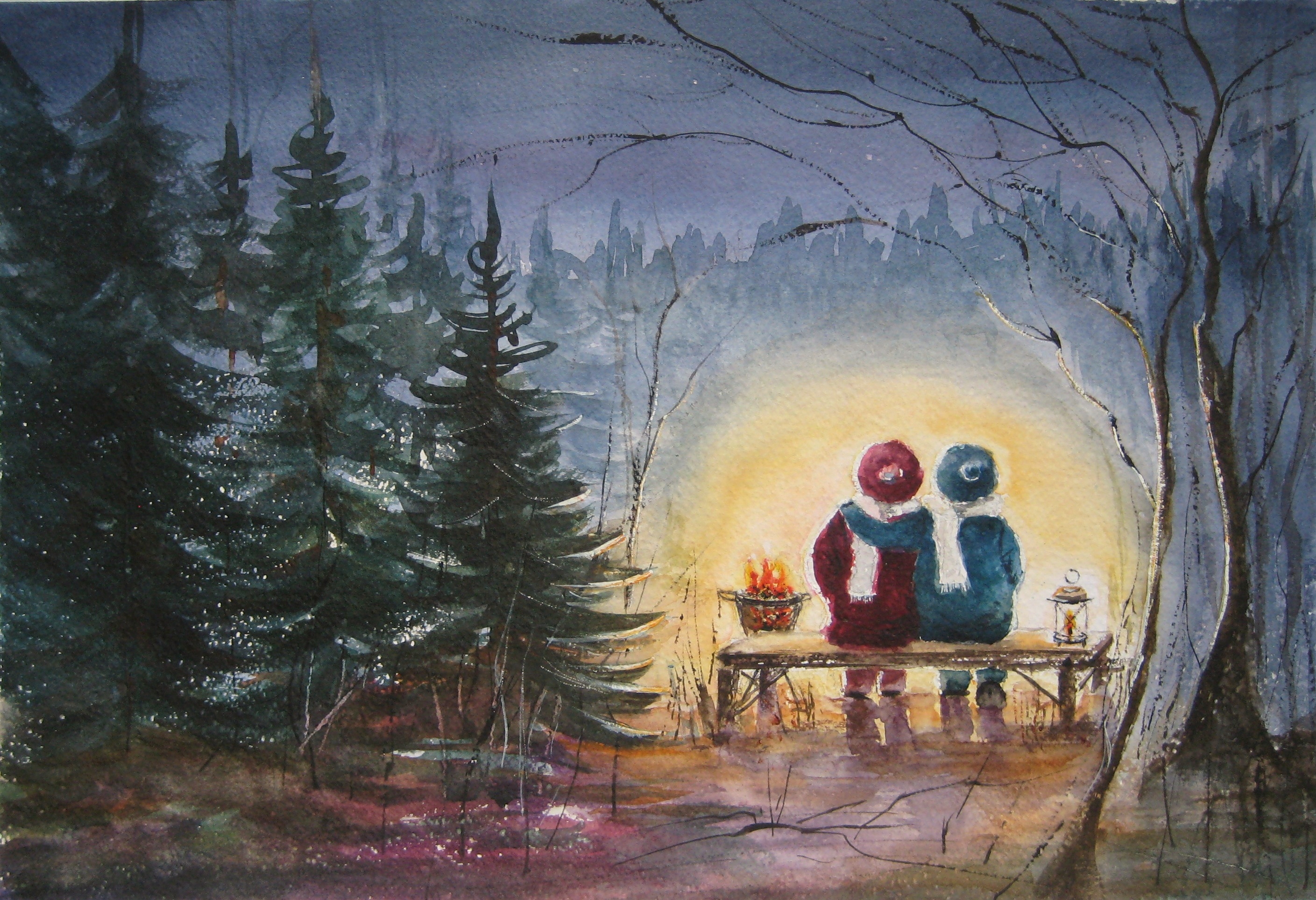 Aquarel bestemd als ontwerp voor een kerstkaart, met daarin proberen de sfeer over te brengen van de nacht als zowel de warmte van het vuur.