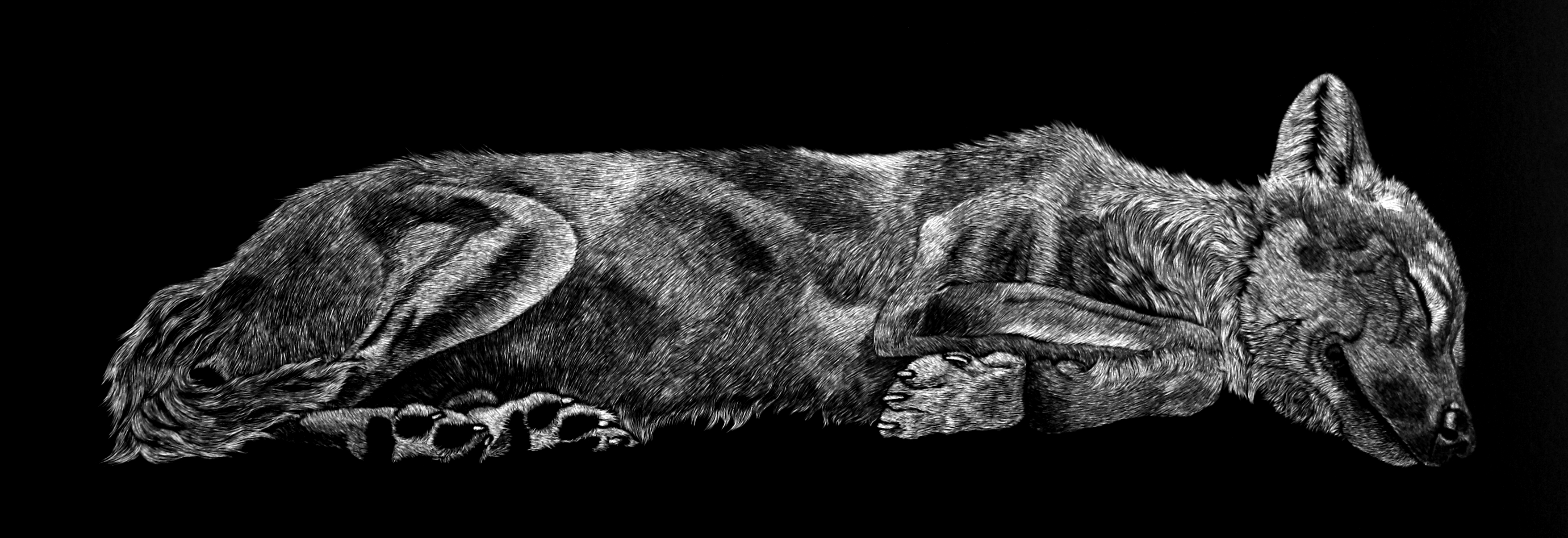 Wolf Canis lupus lupus. Slapende Wolf. Gravure in Oost-Indische inkt. Foto van de gravure op aanvraag beschikbaar via de tab contact. Gravure te koop.
