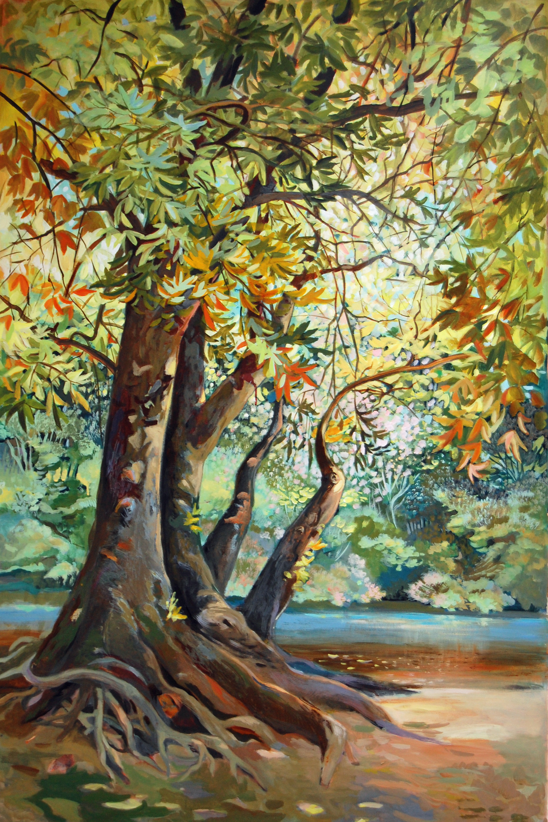 Blue Water Bladeren Acrylverf Boom Warm Tree Stam Wortels Griekenland Greece Details Plataan Snel Spontaan Zagoria