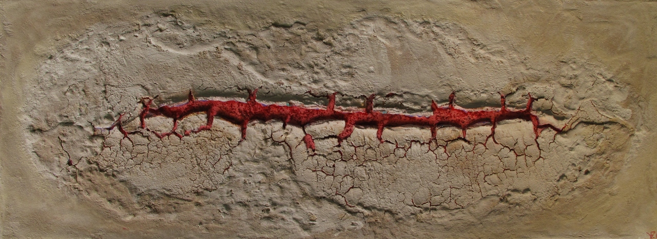 Een krachtspel onder de huid. Dit werk gaat over gevoelens die een weg zoeken.