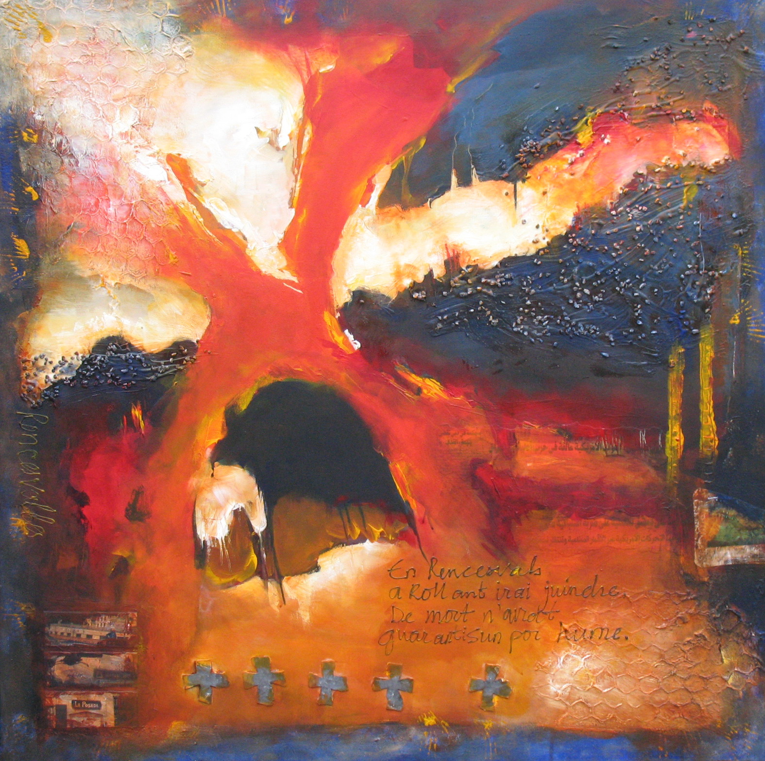 Gesloopt kwam ik aan in Roncesvalles na 28 kilometer steil bergop over de Pyreneeënpas . 's Morgens vroeg vertrokken uit Saint-Jean-Pied-de-Port voor de klim over de Ibañeta (1056 m.): mist en regen, temperatuur 2 graden. Beelden van de wanhopig om assistentie roepende Roeland bonken door mijn hoofd. Maar de legers van Karel de Grote komen te laat. Een historische plek uit de Middeleeuwen waar volgens het 'Chanson de Roland' een eerste Armageddon plaatsvond tussen de Moren (Islamieten) en de Christenen. Neverending story. De prijs is inclusief brede zwart-gouden baklijst.