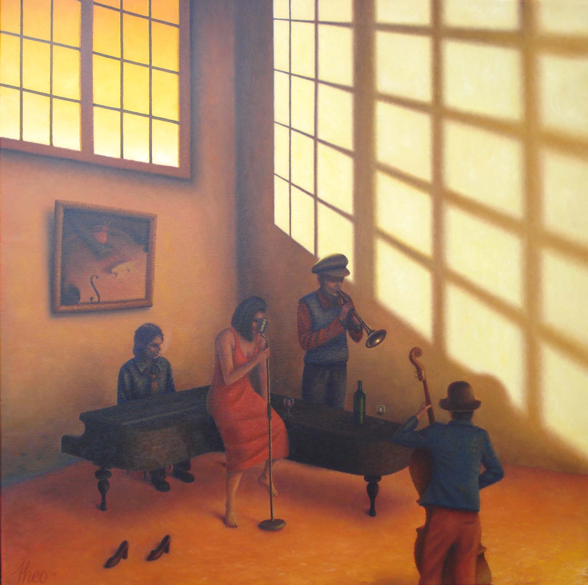 Na het voltooien van een grafische opleiding en jarenlange zelfstudie is Theo Leering sinds enige tijd full time werkzaam als beeldend kunstenaar. Zijn stijl valt moeilijk in één hokje te plaatsen maar is altijd figuratief. Het beweegt tussen realistisch en absurdistisch en is vaak melancholisch van toon. Achter deze melancholie schuilt te allen tijde een sprankje hoop. De thema’s lopen sterk uiteen al speelt muziek in veel van zijn werk een belangrijke rol. In principe kan alles wat op zijn netvlies verschijnt, hoe klein of ogenschijnlijk nutteloos ook, dienen als idee voor een schilderij. In opdracht maakt Theo portretten en muurschilderingen. Daarnaast geeft hij een aantal dagdelen per week les in tekenen en schilderen.