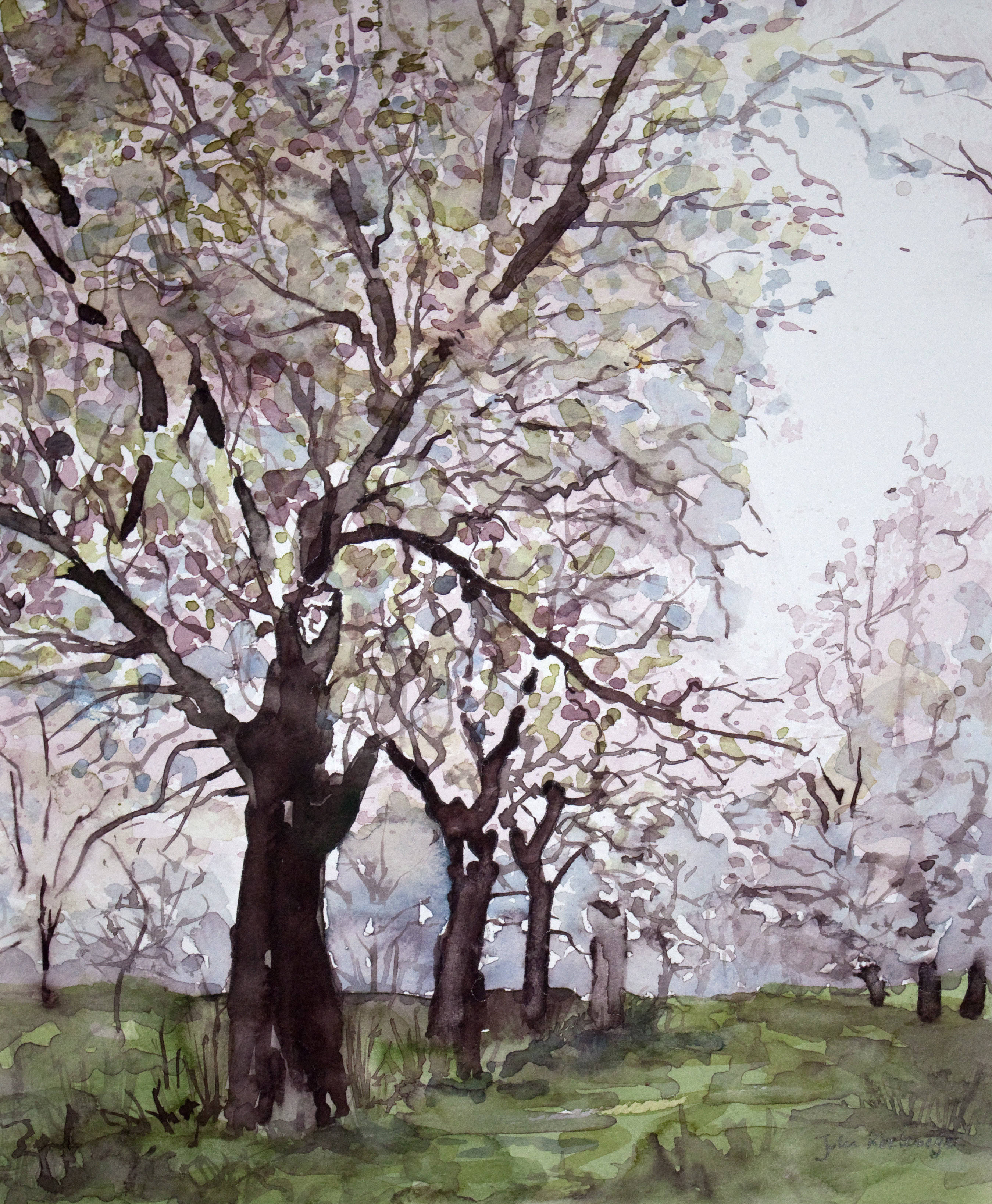 Landschap Rose Aquarel Voorjaar Realistisch Natuur Boomgaard Roze Appelbomen Landscape Nature Realistic Watercolour Orchard Appletrees Spring