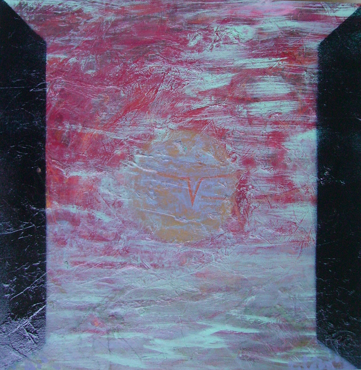 raam uitkijkend op geabstraheerd landschap met twee vogels en zon