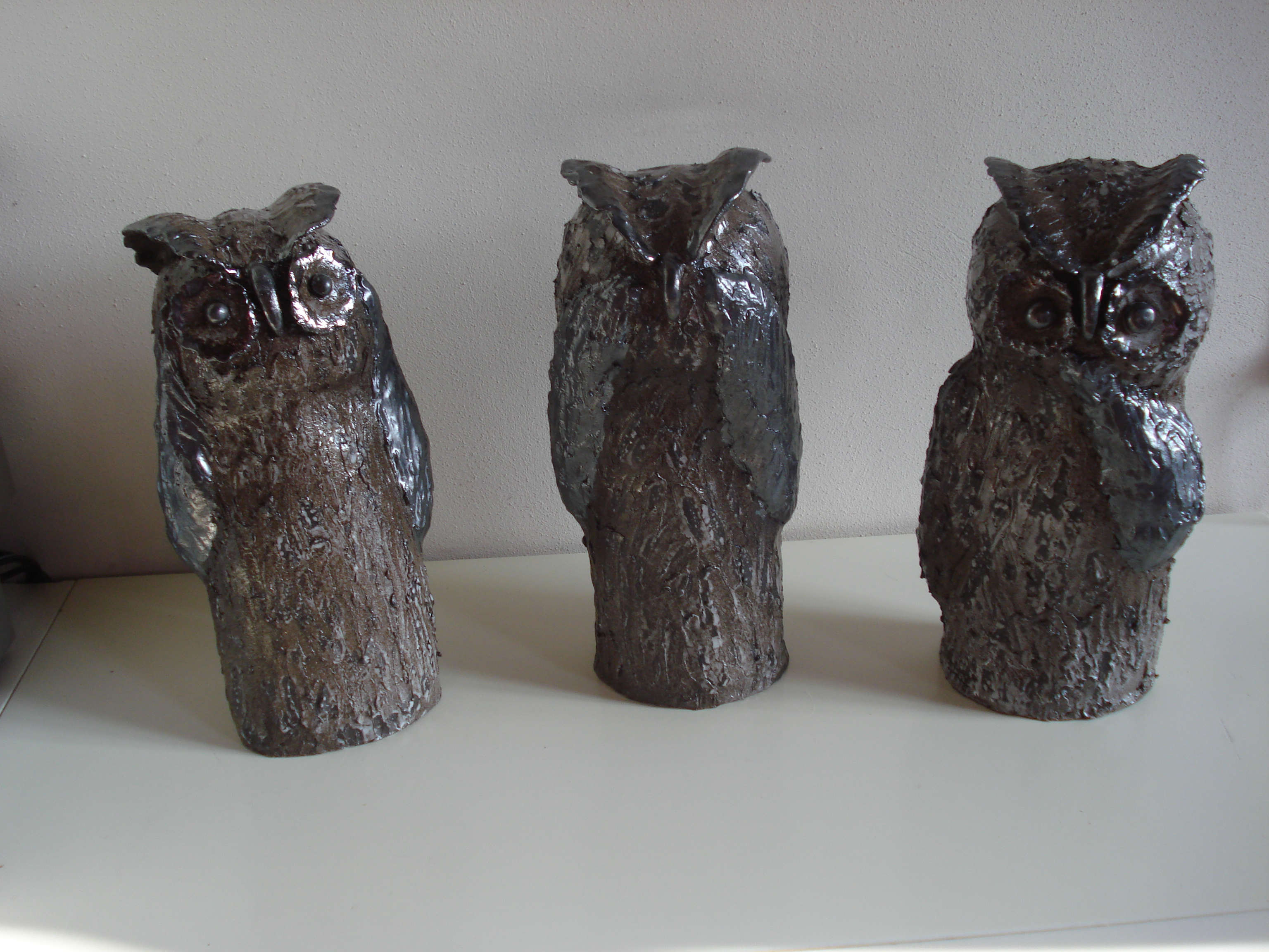 drie uilen die niet horen, zien en zwijgen, geglazuurd met twee verschillende glazuren