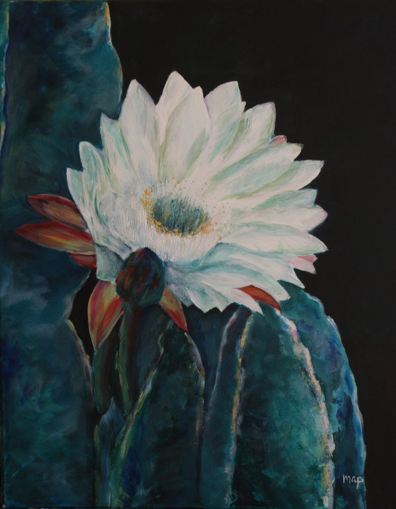 Bloeiende cactus, groot in beeld gebracht. Eenvoud door alleen in te zoemen op een gedeelte van de cactus. Voornamelijk koele kleuren gebruikt, wanneer je het werk goed bekijkt zie je dat het heel kleurrijk is.