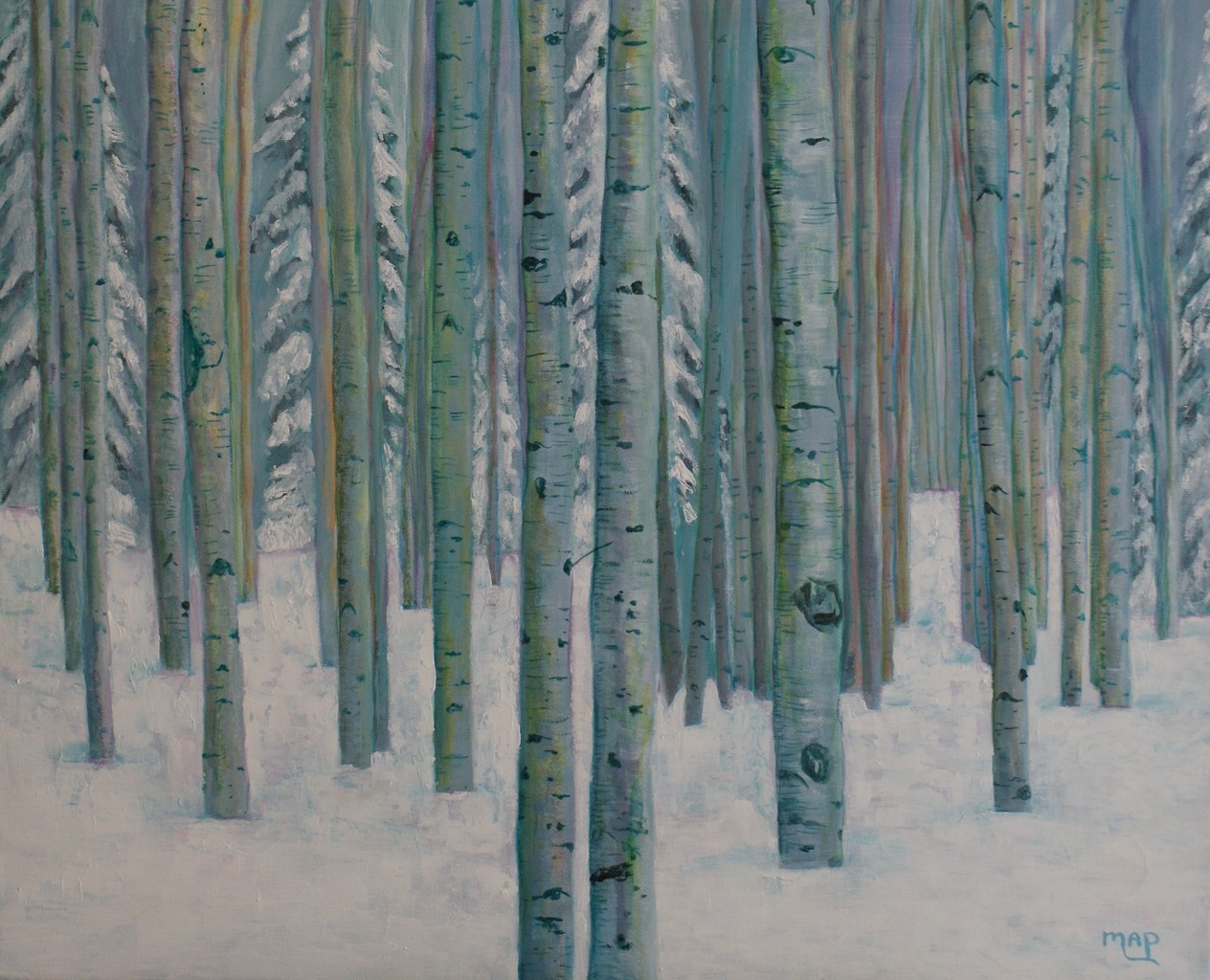 Berkenbos, de stammen en de herhaling van deze compositie blijft bij boeien. De kleuren zijn zacht en geven het een spiritueel tintje. Het straalt rust en verstilling uit.