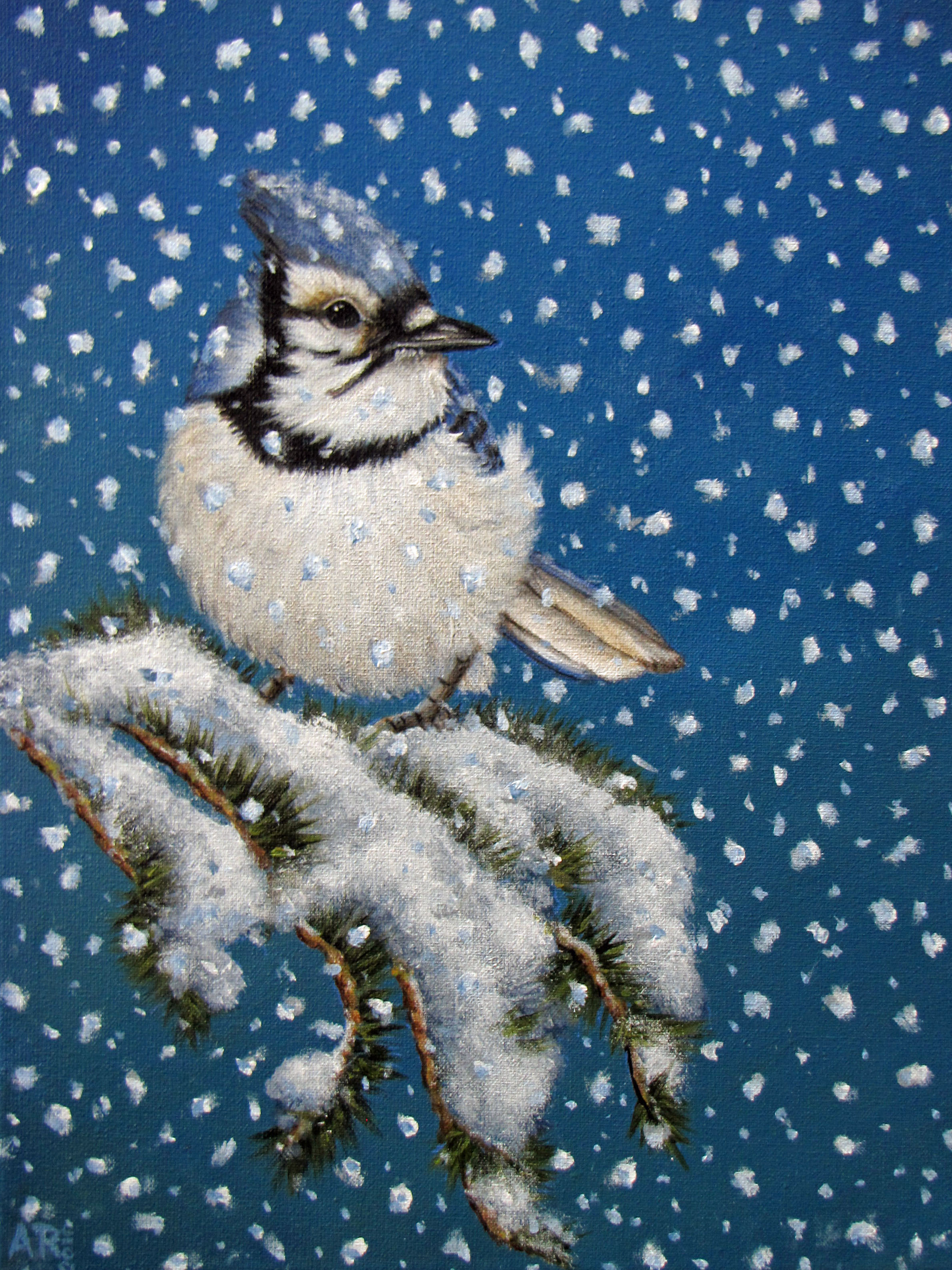 Schilderij Blauw Acryl Vogel Wildlife Art Blue Dier Sneeuw Painting Winter Bird Animal Snow Christmas Jay
