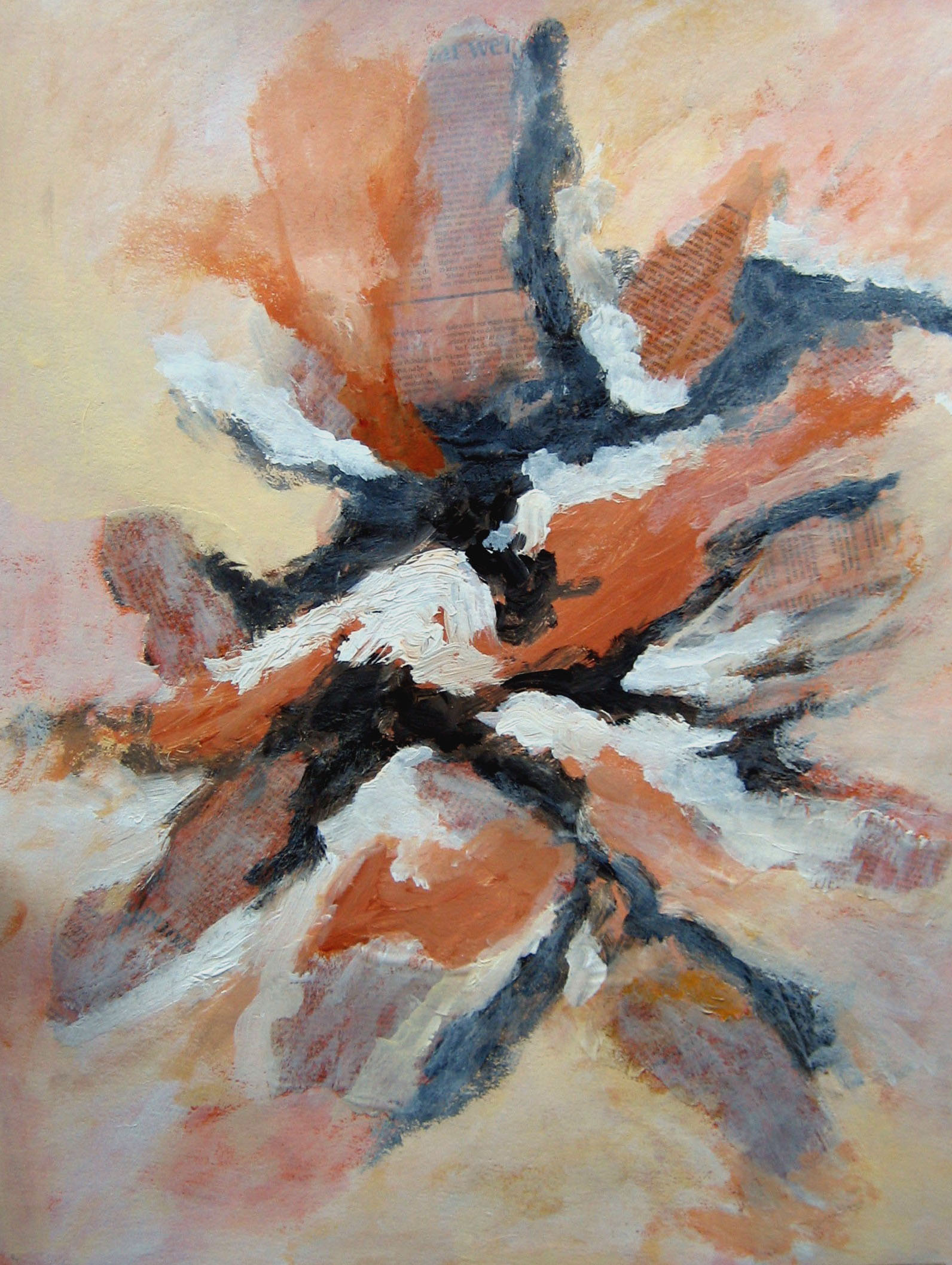 Compositie op basis van gescheurde krantenknipsels, ingekleurd met gebrande siena, oker, zwart en wit. Opdracht R. van Vliet.