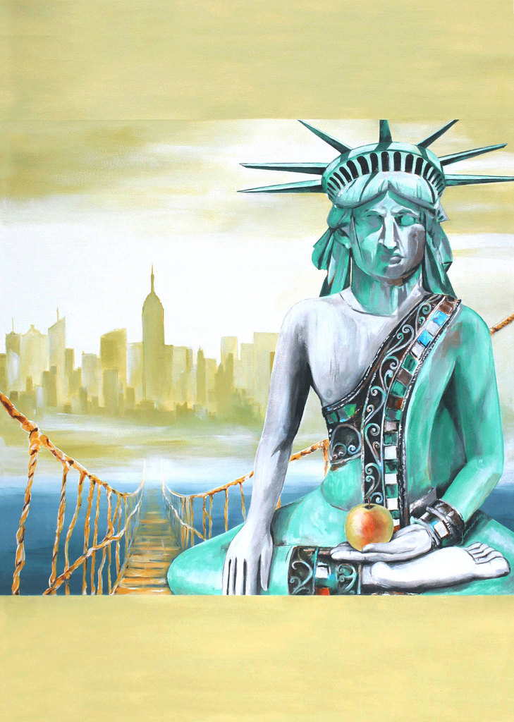 De ultieme drukte (New York) in evenwicht met de ultieme rust van boeddha. ©2014 Yvonne van Zon.