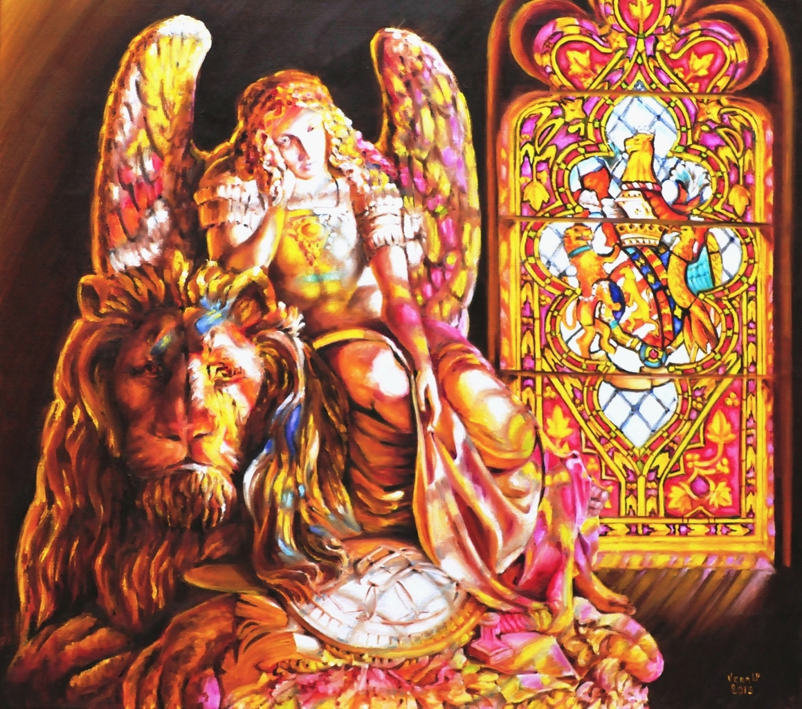 Onderwerp: Het standbeeld van een dromerige engel, badend in het licht van een glasraam. De titel slaat zowel op de weerpiegeling van het glasraam op het beeld, als op de introspectieve houding van de engel.