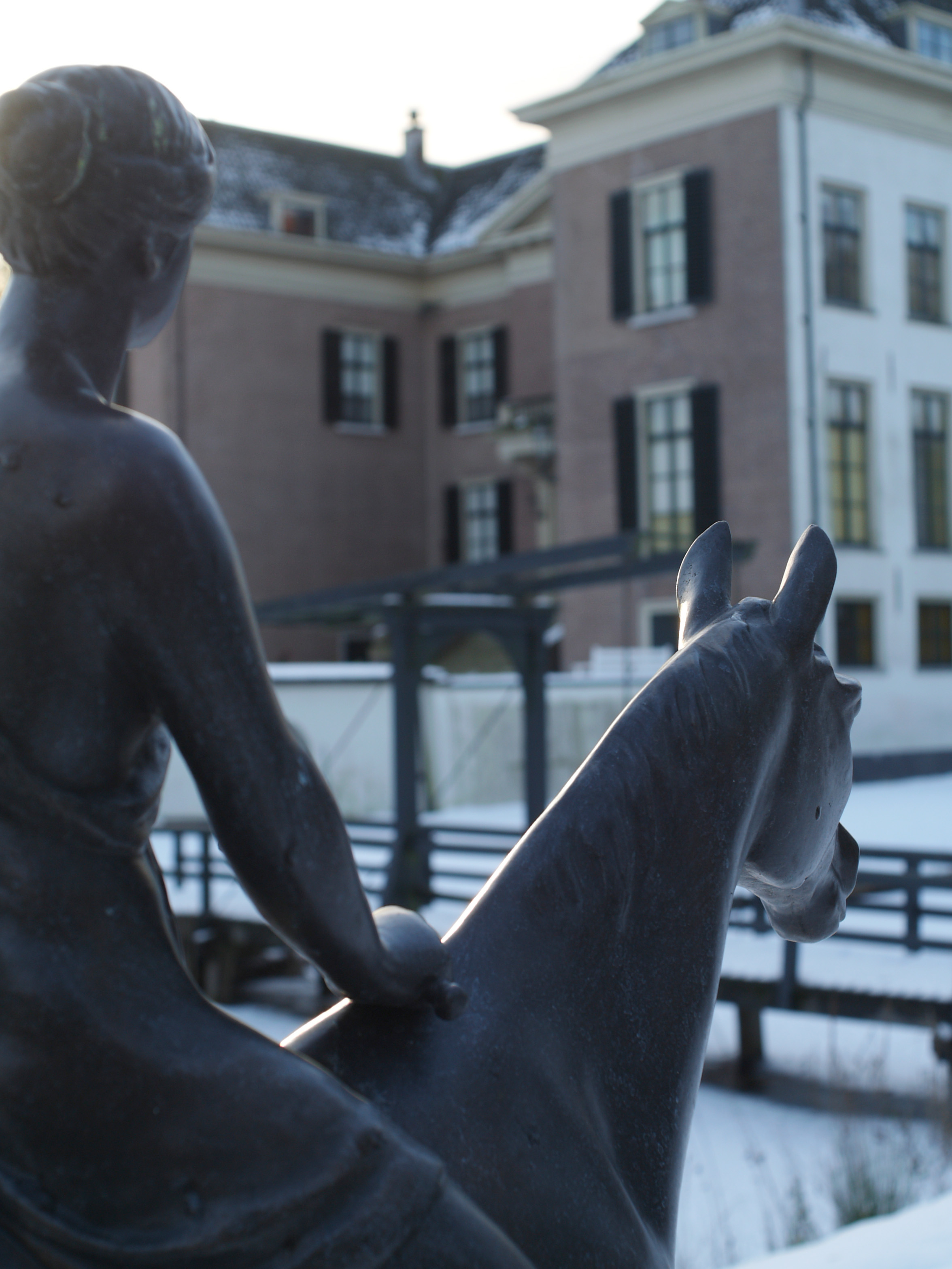 Beeld van een beeld en een gebouw. Het beeld "Amazone" ca. 1890 van Louis Tuaillon, is in juni herplaatst nadat het origineel enige jaren geleden verdwenen is.