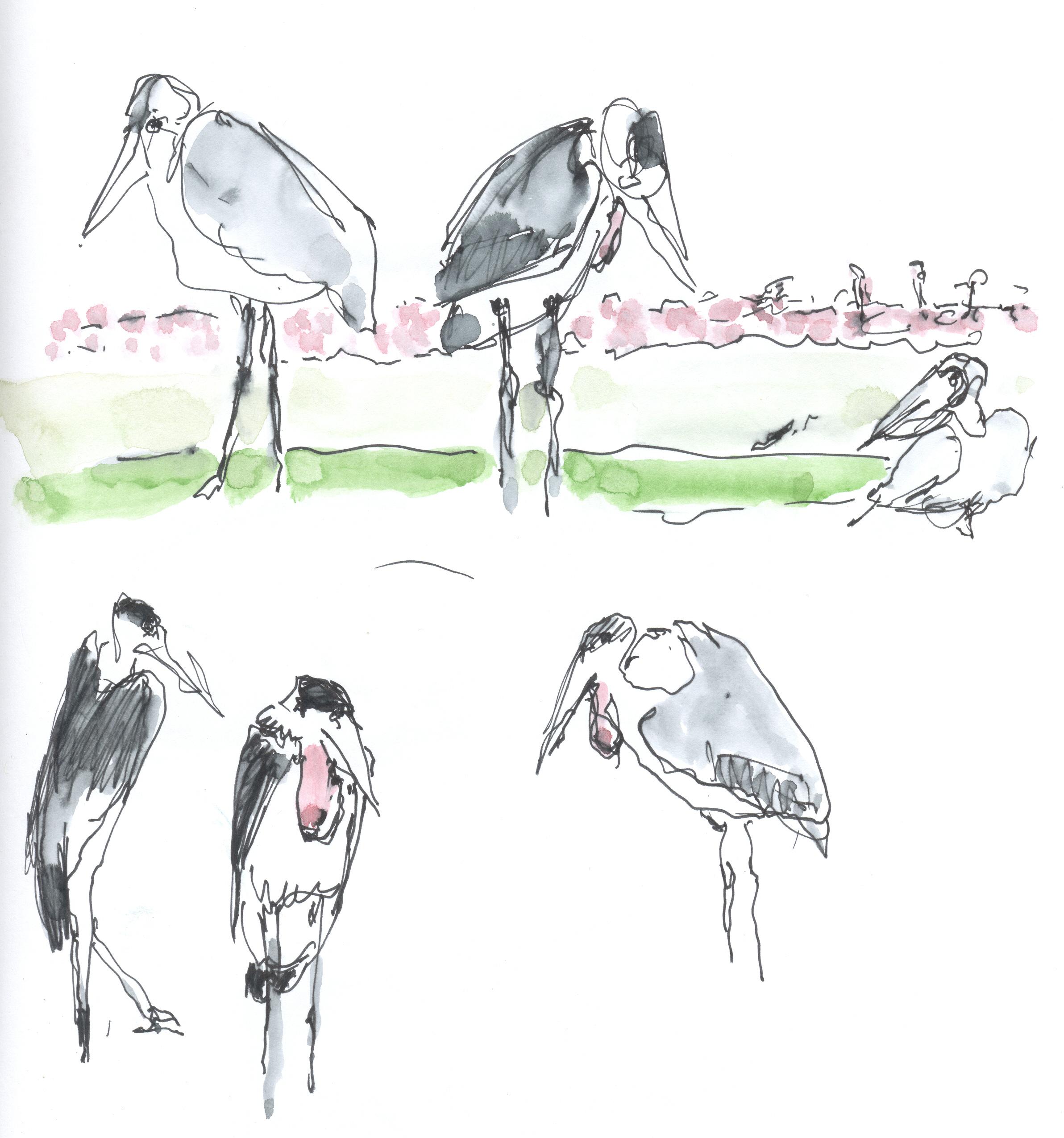 Marabu's en duizenden flamingo's, hier en daar een pelikaan of kiviet. Ook oeverlopertjes.
