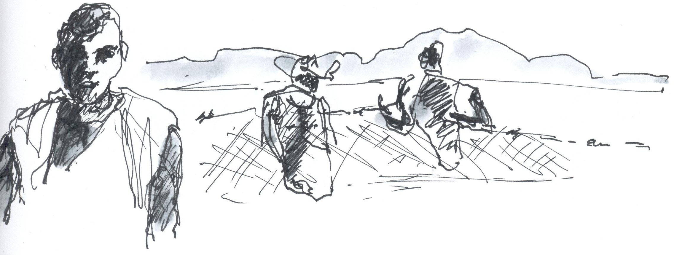 Vissers staande in Lake Baringo. Verderop nijlpaarden. Krokodillen ook nog? Gevaarlijke job!