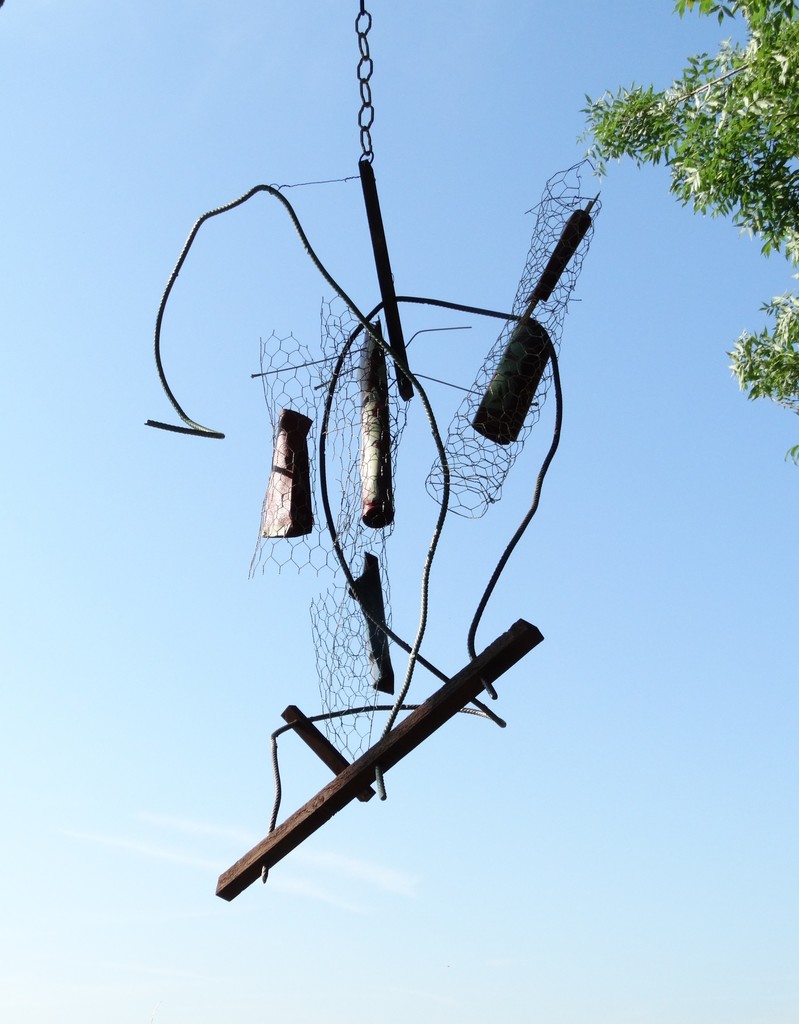Ongevaarlijk: zou willen dat meer mensen / zulke vliegende voorwerpen zouden maken. // De wereld / zou er meer als onze tuin uitzien / op deze ochtend. // De zon schijnend op bloemen met bijen / en een specht die uitkijkt / daar waar spechten naar uitkijken. Assemblage / installatie, hout - betonijzer / skai leer, gaas, draad en verf. (afbeelding met meer beeld qua kleur: http://www.pinterest.com/pin/409546159837346488/. op film: zie link)