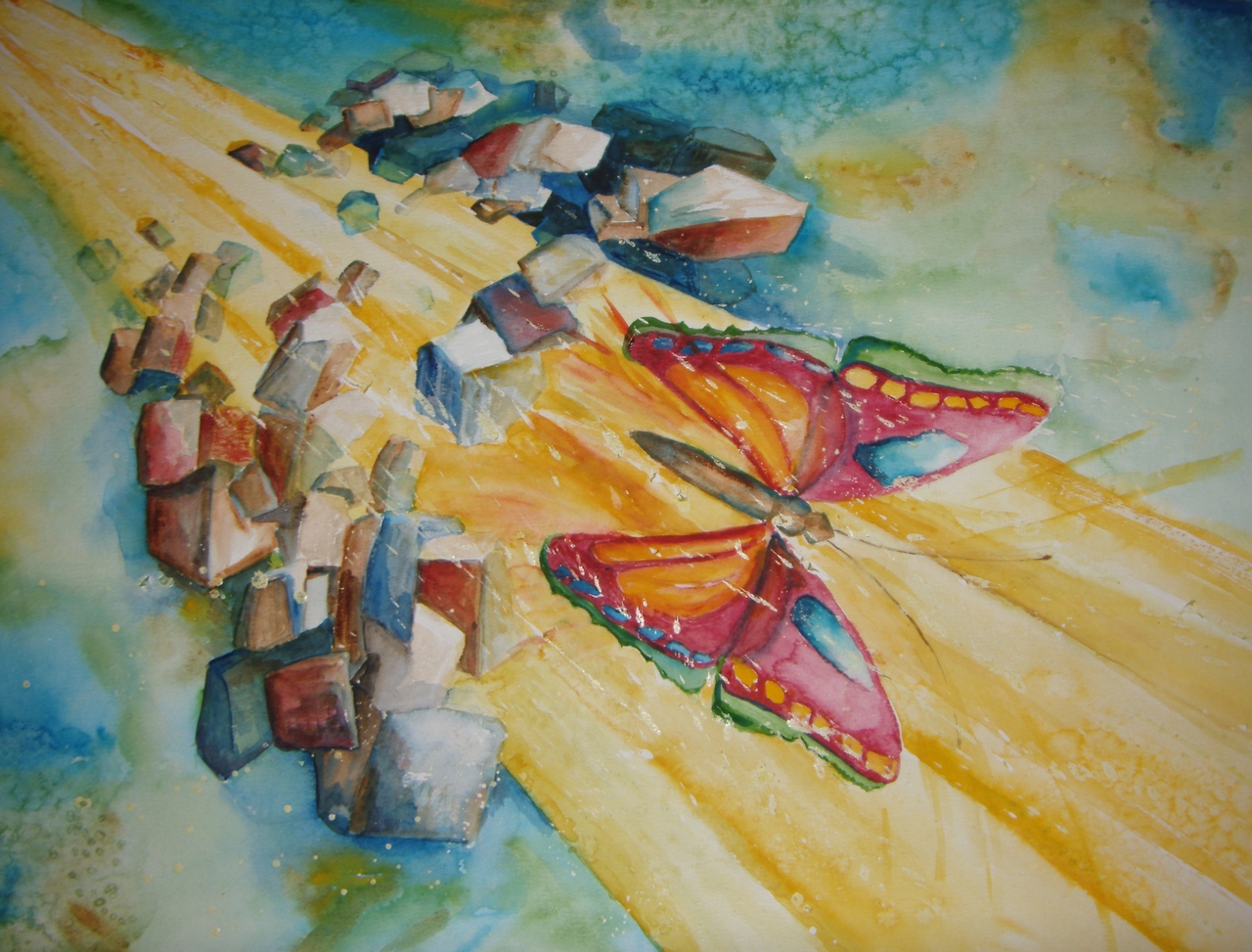 Een kwetsbaar dier als een vlinder. Eerst al ontpopt tot 'zijn'. Een hele tour... Nu moet zij dwars door de brokstukken heen vliegen. Zal het haar beschadigen / breken? Nee, ze wijken. Voor schoonheid en kracht en doorzetten en vertrouwen. Ze komt tot haar doel. Tot wie ze mag zijn. Zonder lijst of passe-partout