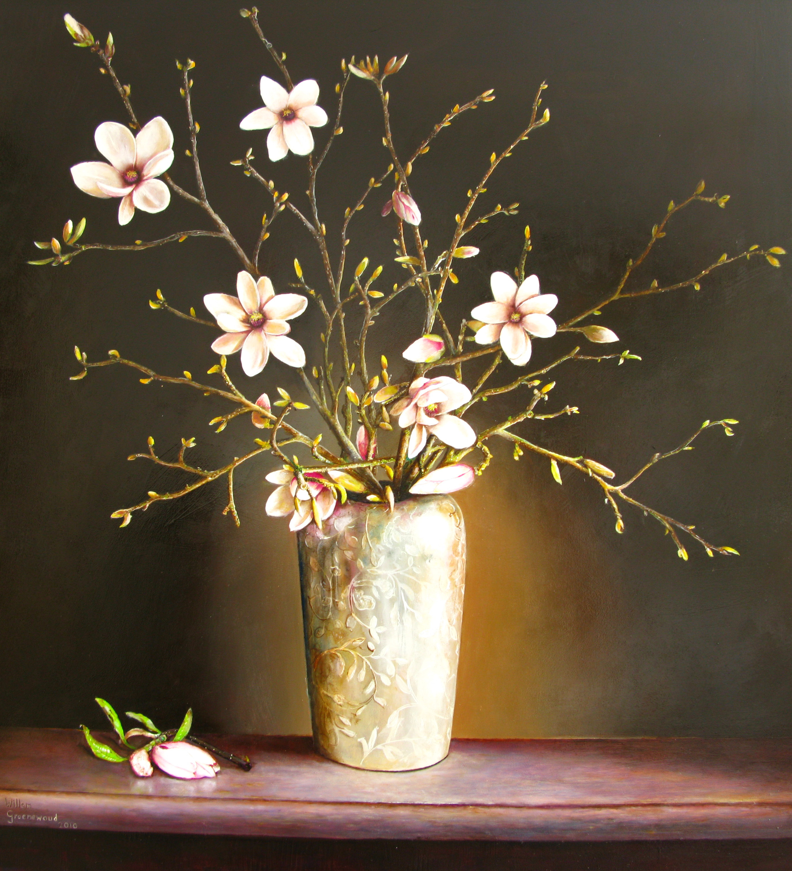 Magnoliatakken met hun eigen karakteristieke vorm , gezet in een zilveren vaas.