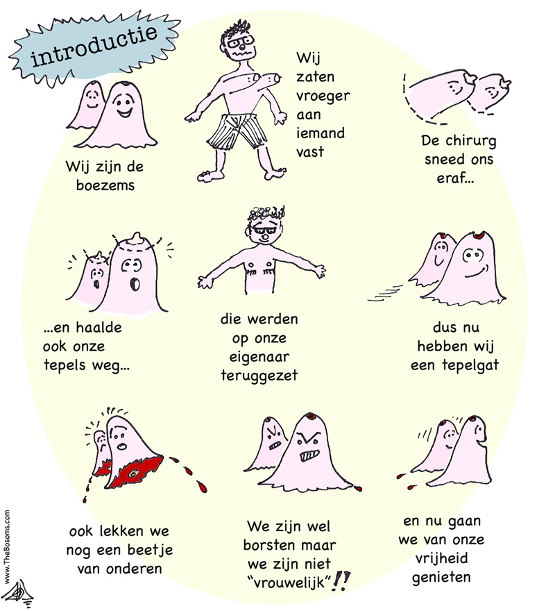 De 'Suspension of disbelief' heerst in de queer strips van transgender tekenaar Jiro Ghianni. Zijn boezems, die uit het ziekenhuis zijn ontsnapt, nadat zij van hun transman verwijderd zijn, verkeren in een parallel universum waar lichaamsdelen zelf hun eigen gender mogen bepalen. Hier de eerste tekening.