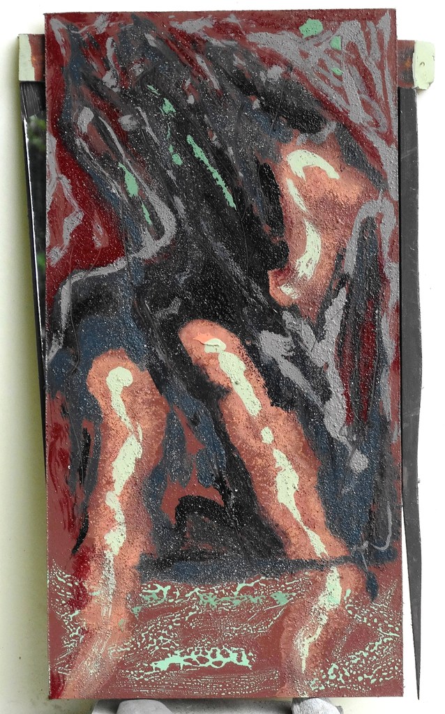 Geen stijl: Puur vierkant of rechthoek, / dat is niet voor mij. // Circkel, dat is andere koek, / hoewel ovaal beter is. (Assemblage, hardboard, hout, spiegel scherf, acryl-verf.)