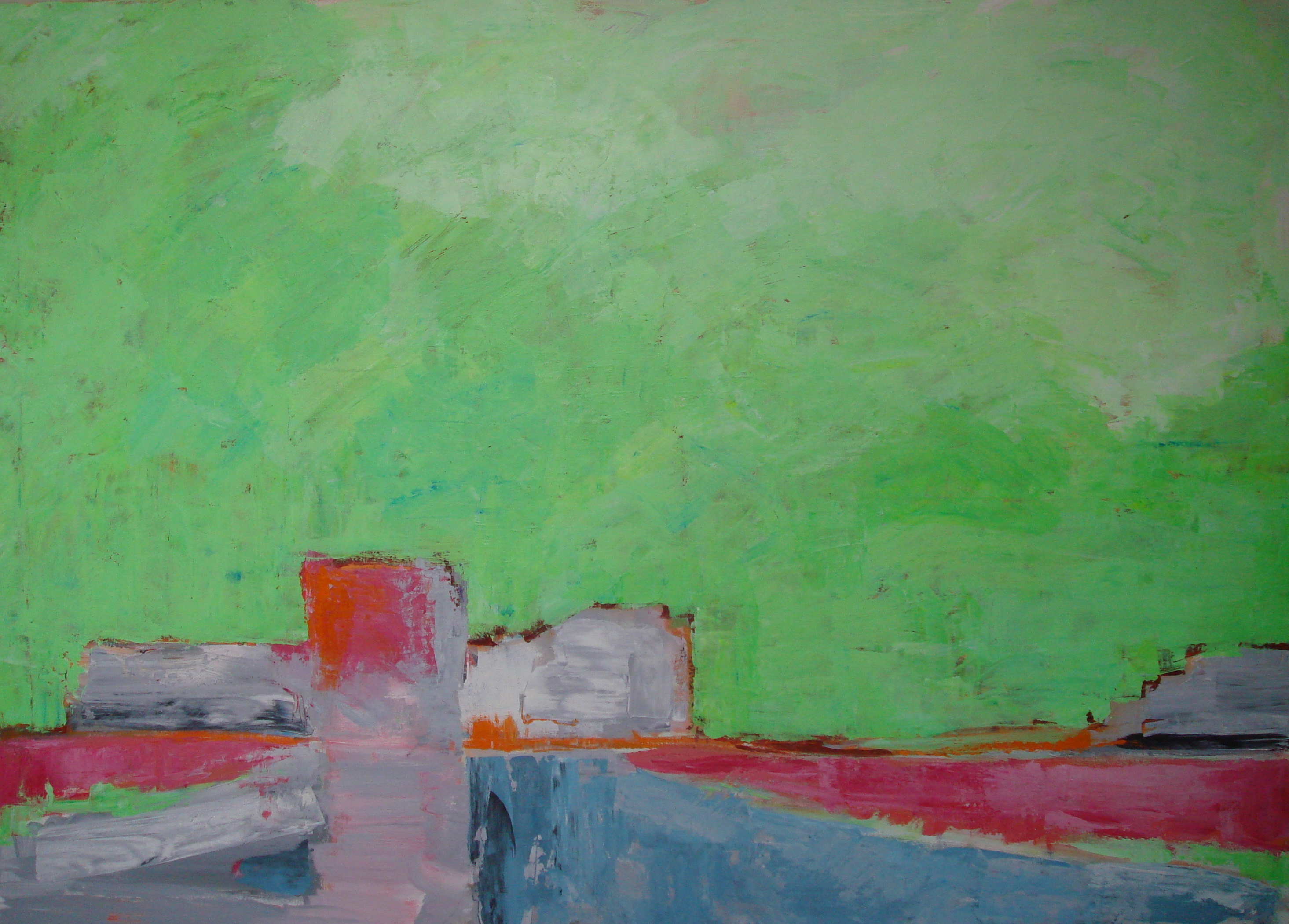 Grijs Landschap Acryl Groen Canvas Doek Acrylverf Roze Nicolaas Stael Paletmes Rood Oranje Sienna Omber Lichtblauw Donkerblauw Blauw Geel Zwart Polder Weiland
