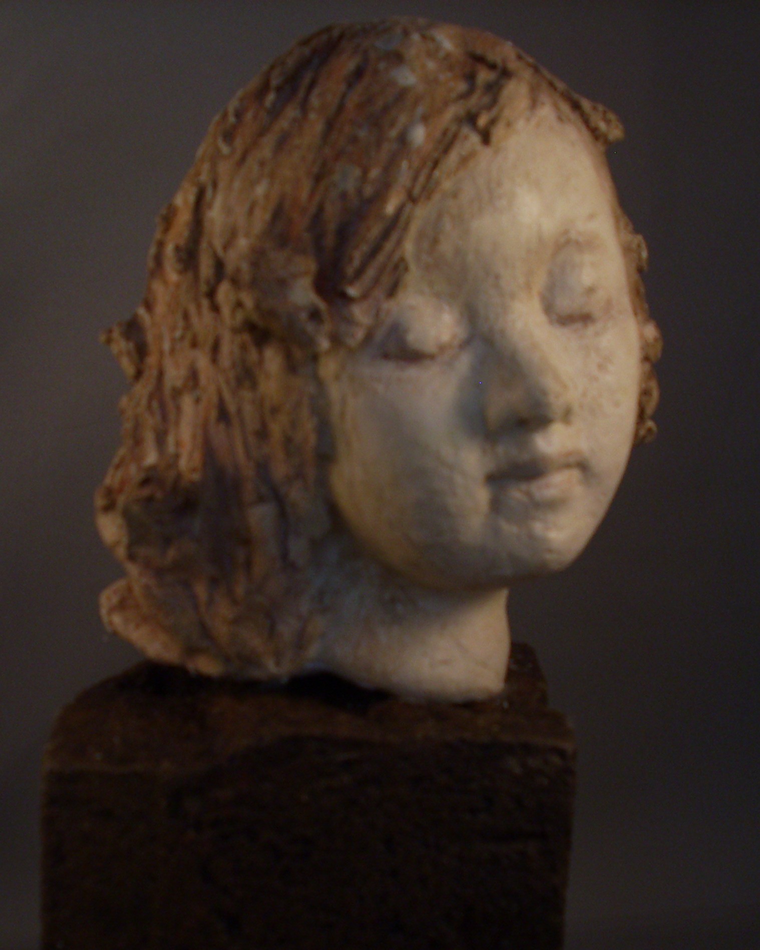 Meisjeshoofd op stenen sokkel, licht bewerkt met oxydes en ingepoetst met was.