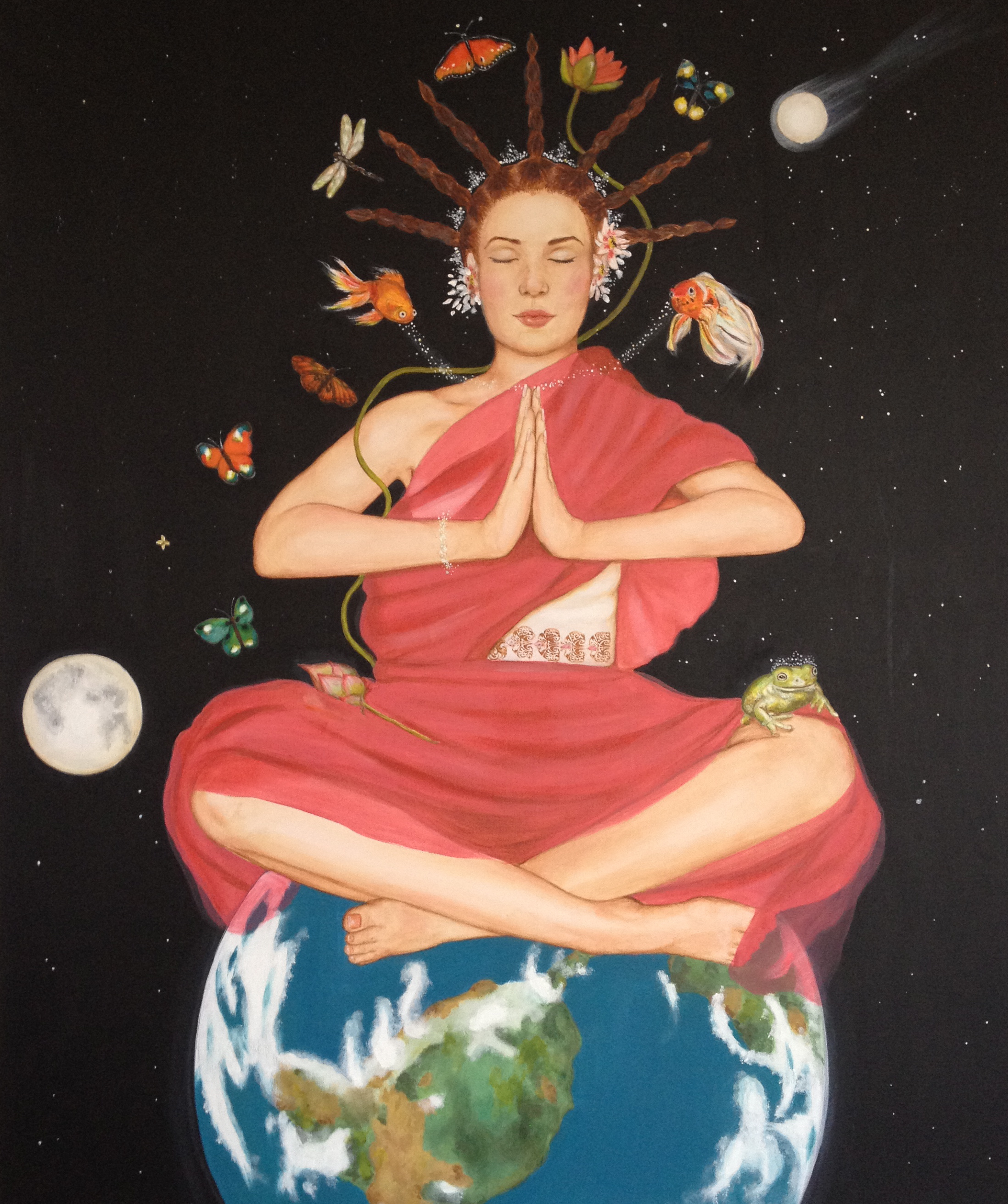 Mediterende vrouw "on top off the world" omgeven door dieren/bloemen ( symbolen), acryl op canvasdoek