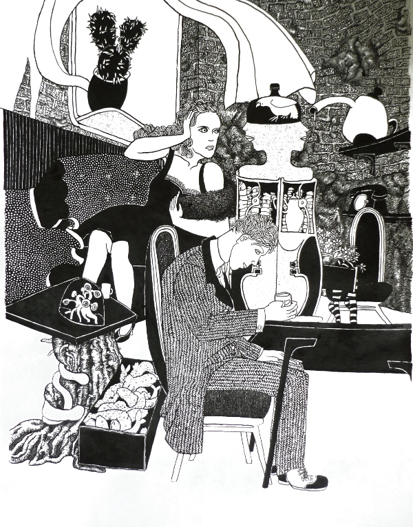 Ellen werkt met pen en inkt en tekent intieme, huislijke taferelen, die bij nader beschouwing vaak surrealistisch van aard zijn en toch óh zo herkenbaar. Haar tekeningen ontstaan geheel op intuïtieve wijze meteen in inkt op het papier, zonder plan of schets vooraf.