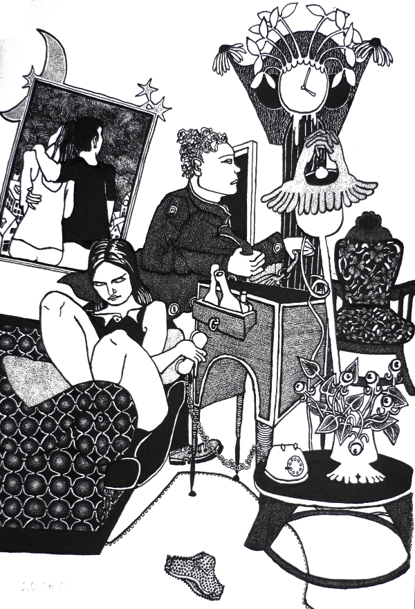 Ellen werkt met pen en inkt en tekent intieme, huislijke taferelen, die bij nader beschouwing vaak surrealistisch van aard zijn en toch óh zo herkenbaar. Haar tekeningen ontstaan geheel op intuïtieve wijze meteen in inkt op het papier, zonder plan of schets vooraf.