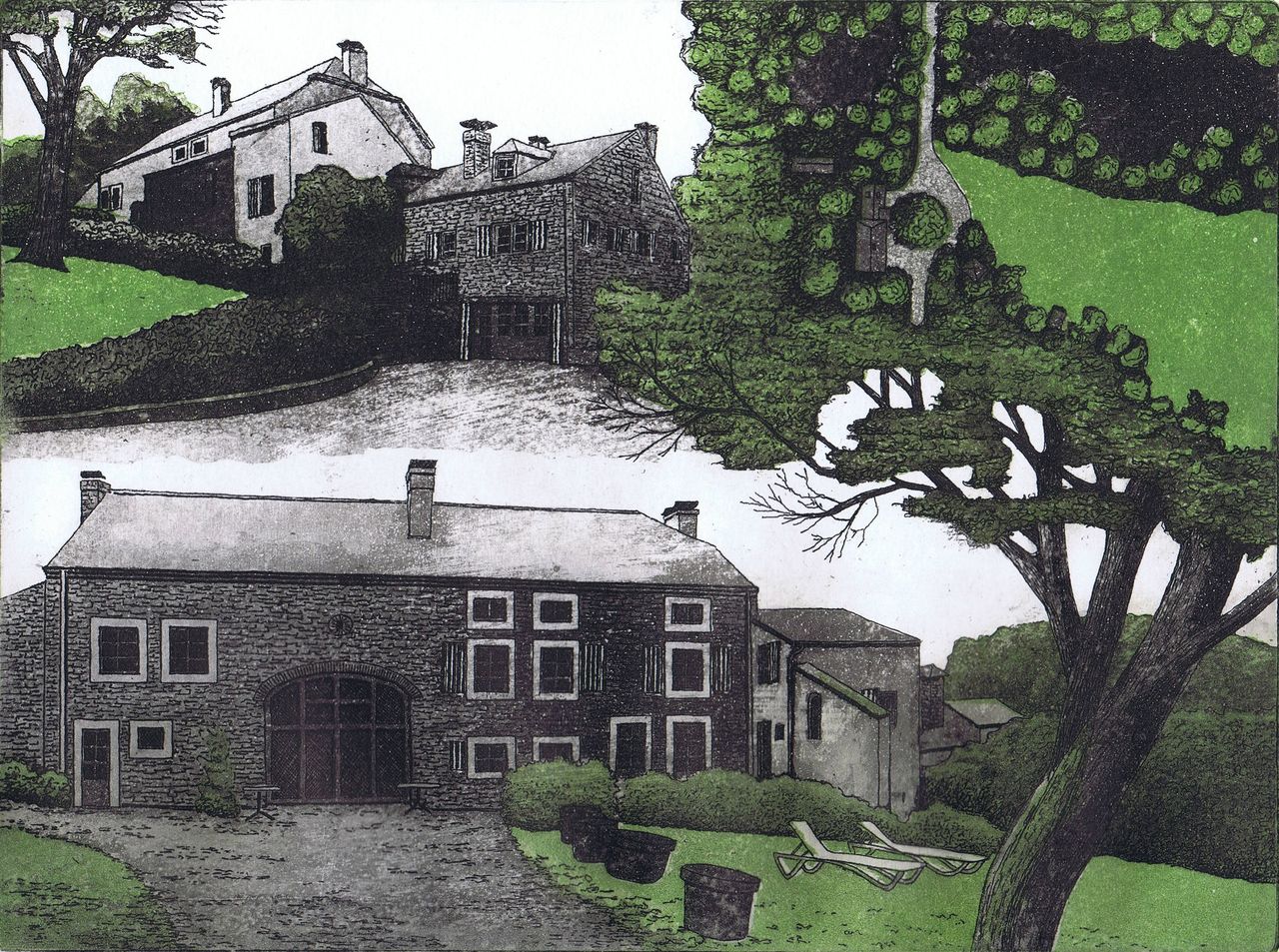 Een collage-ets van een tot hotel omgebouwde watermolen in de Belgische Ardennen. Maximale oplage 40 stuks. Tot nu toe 6 gedrukt.