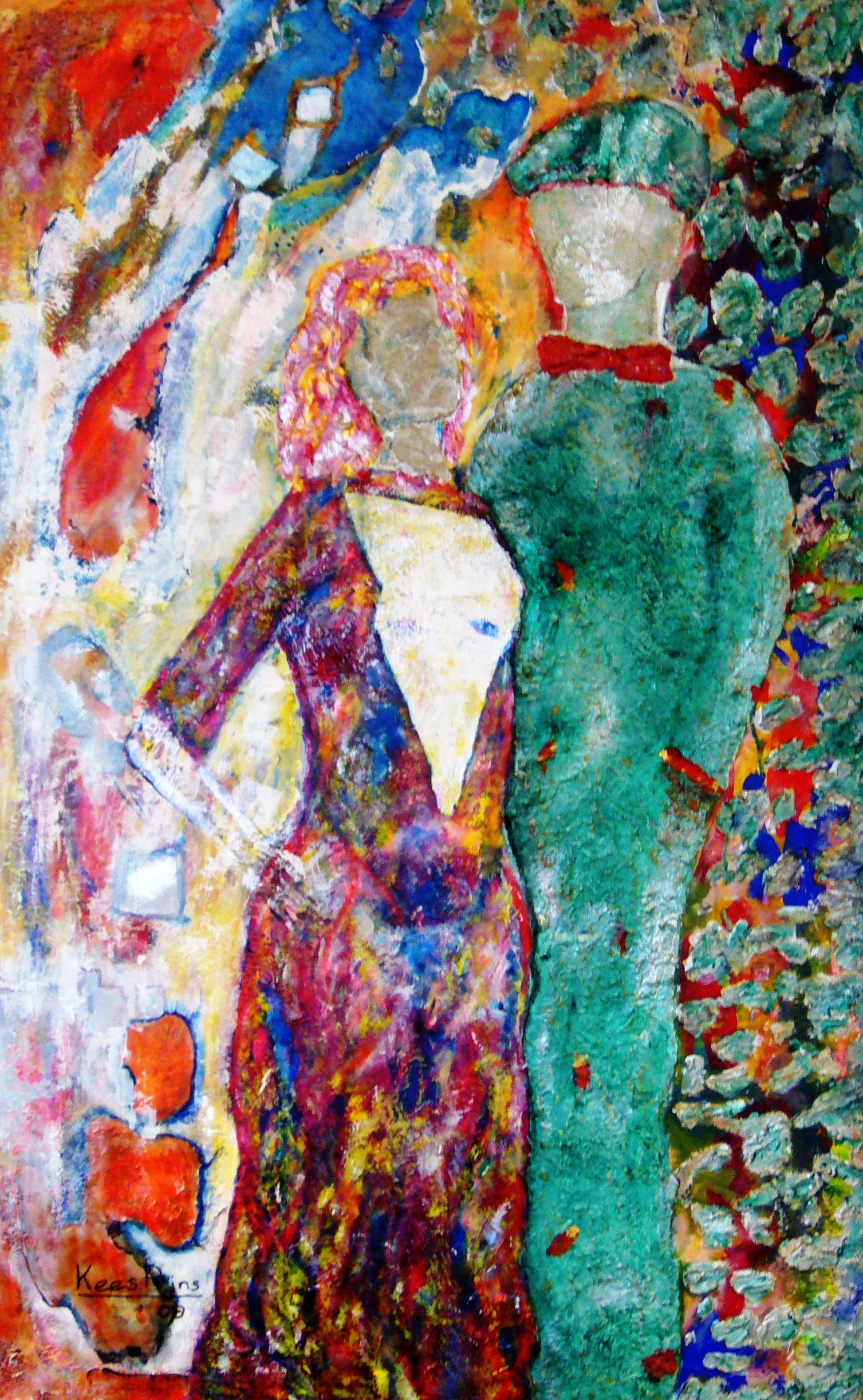 Hoewel het schilderij in 2008 pas af is gemaakt hoort het toch echt bij de eerst acryl jaren. Het is eigenlijk de directe opvolger van 'De seizoenen ontvangen de lente' De rechterfiguur in dat schilderij was zo goed uitgepakt dat ik de deze techniek met zand en zilververf nog een keer wilde gebruiken. Ook de techniek van de figuur links uit dat schilderij komt terug in de jurk van de vrouw. De achtergrond komt ook voor een groot del daar vandaan. Ondanks dat het een heel ander schilderij is wat betreft uitstraling heeft het hergebruik van deze elementen er wel tot geleid dat ik er toch bijna twee jaar over heb gedaan om het als klaar te beschouwen. In een passende omgeving met veel ruimte zoals in de Rechtbank van Rotterdam komt het fantastisch tot zijn recht en straalt het echt het majestueuze uit waar de titel voor staat.