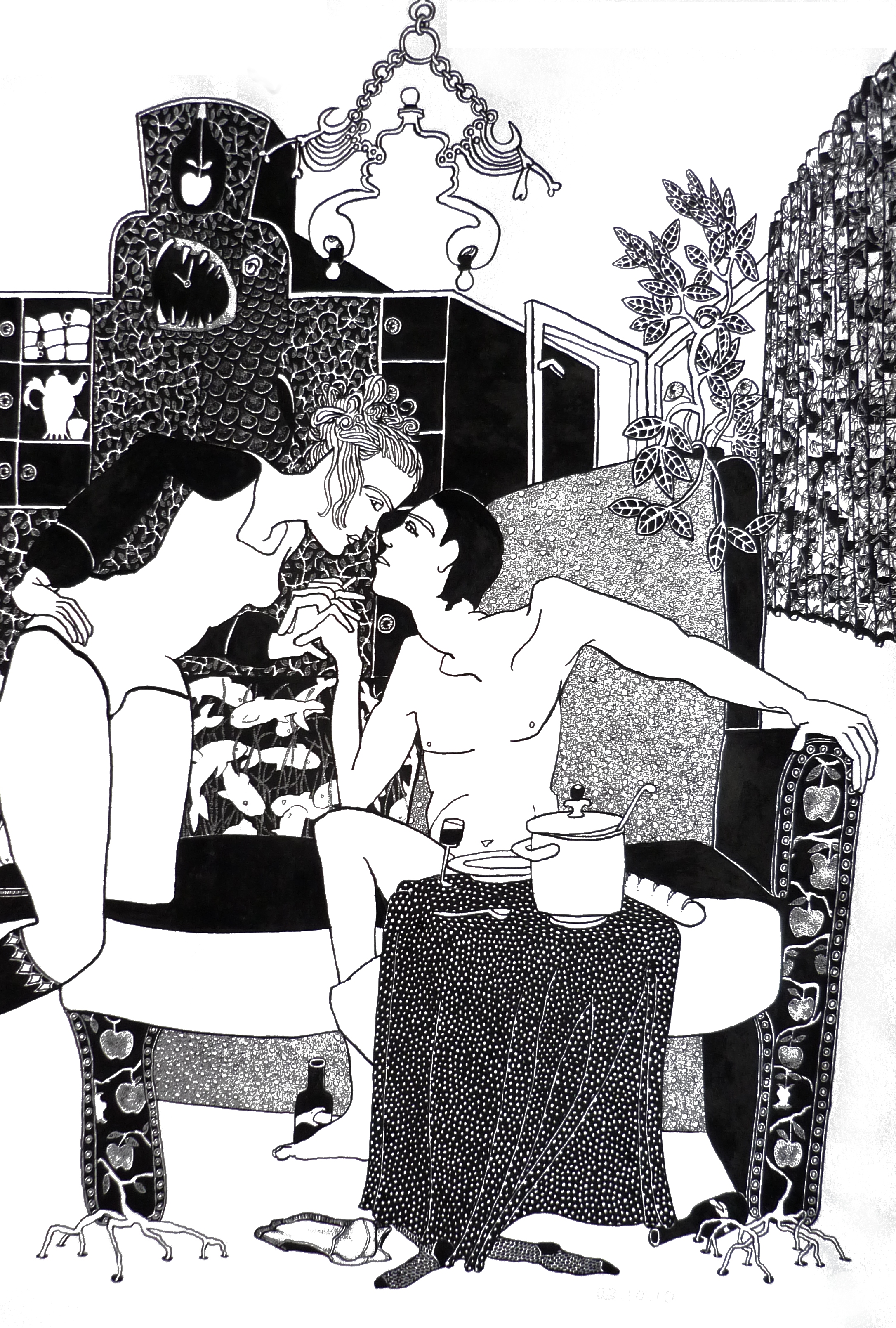 Ellen werkt met pen en inkt en tekent intieme, huislijke taferelen, die bij nader beschouwing vaak surrealistisch van aard zijn en toch óh zo herkenbaar. Haar tekeningen ontstaan geheel op intuïtieve wijze meteen in inkt op het papier, zonder plan of schets vooraf.