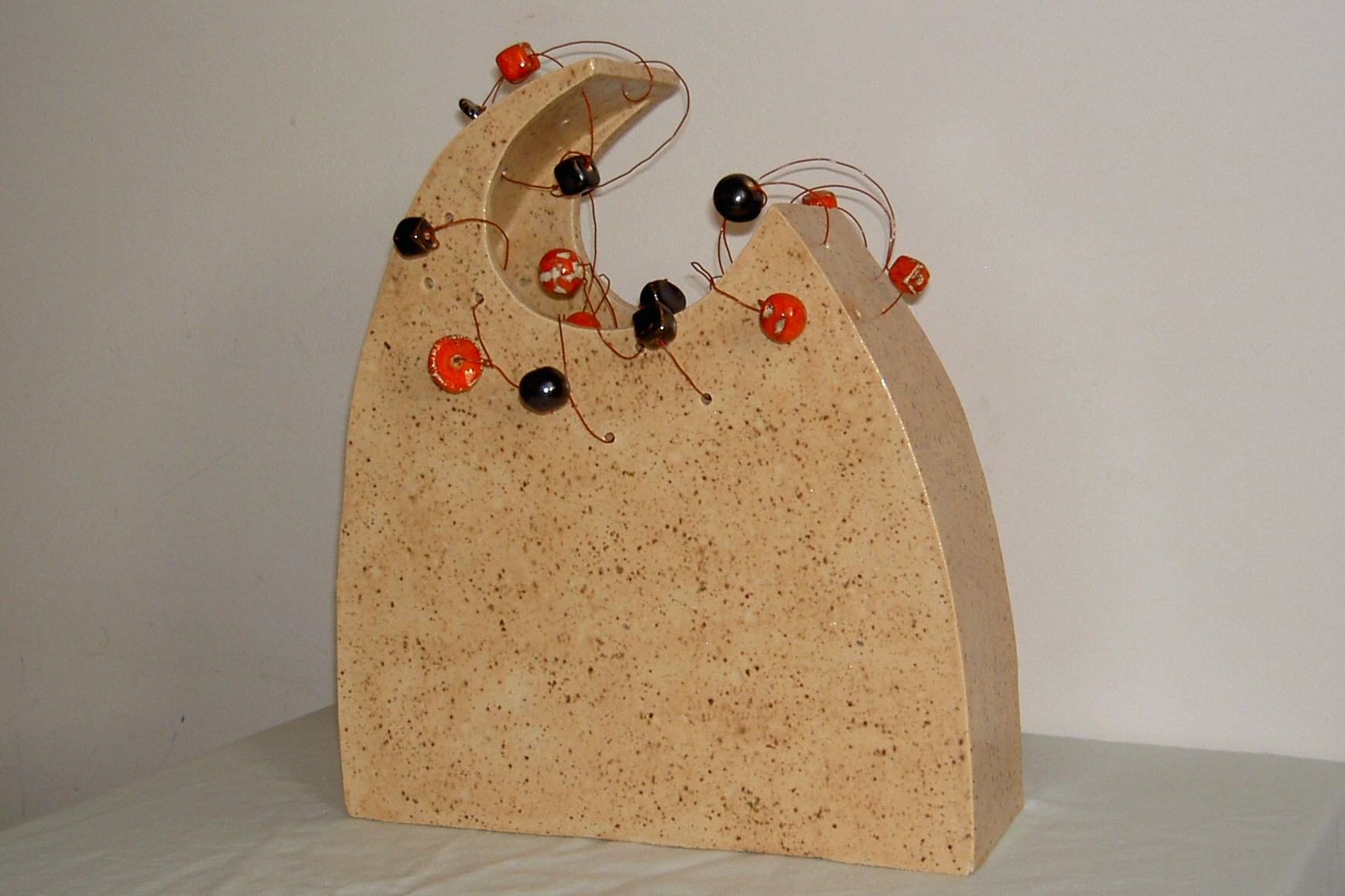 Bij de opening van de vaas zijn draden gespannen met keramische kralen. Deze lijken te zweven boven de C-vormige opening van de vaas.