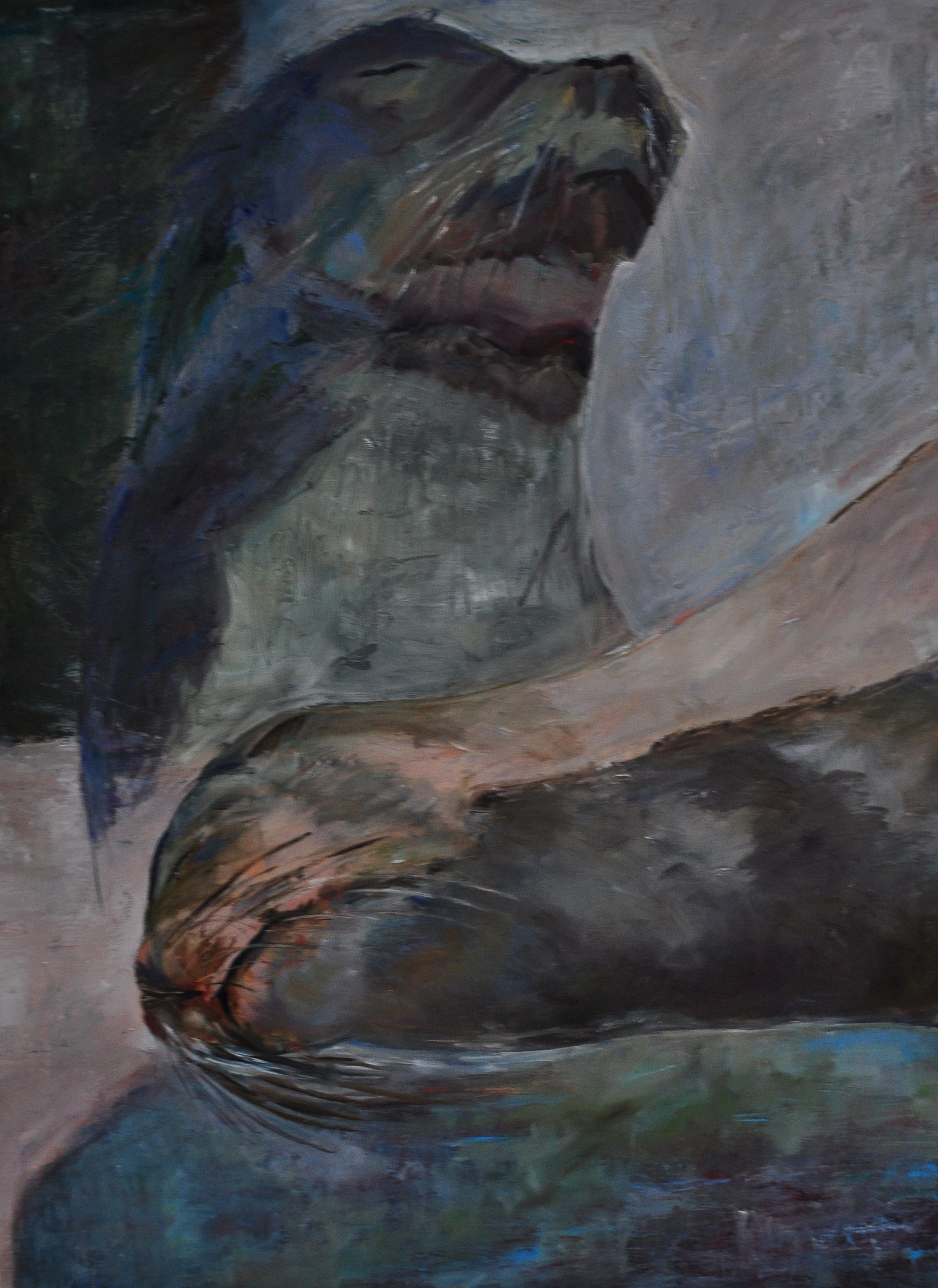 Zeeleeuwen genietend op het strand gekleefd op hardboard