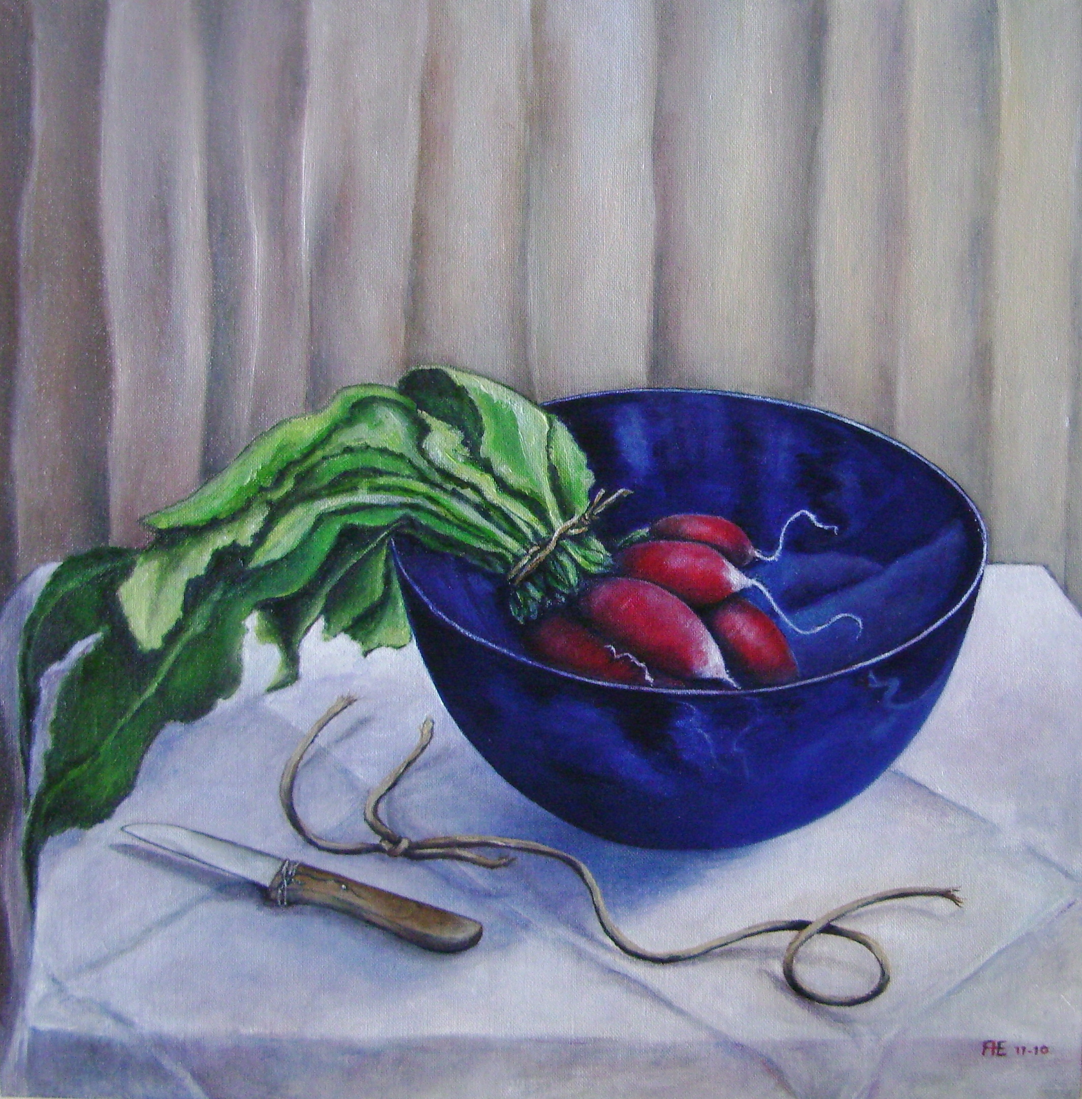 Radijsjes met wortel en blad in blauwe glazen kom op damast met touwtje en keukenmesje.