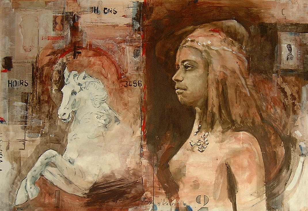 Ik woon en werk in Noord Italie,in het bergdorp Garzeno boven het Como-meer. Mijn schilderijen kenmerken zich door een combinatie van figuratie en abstractie. Grafische elementen, foto's, tekst,collages van stukken krant vormen een essentieel onderdeel van de totale compositie.