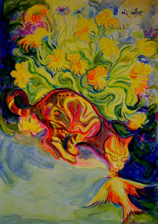 Ruby de poes vangt een gouden vogel. In de achtergrond staan goudsbloemen.