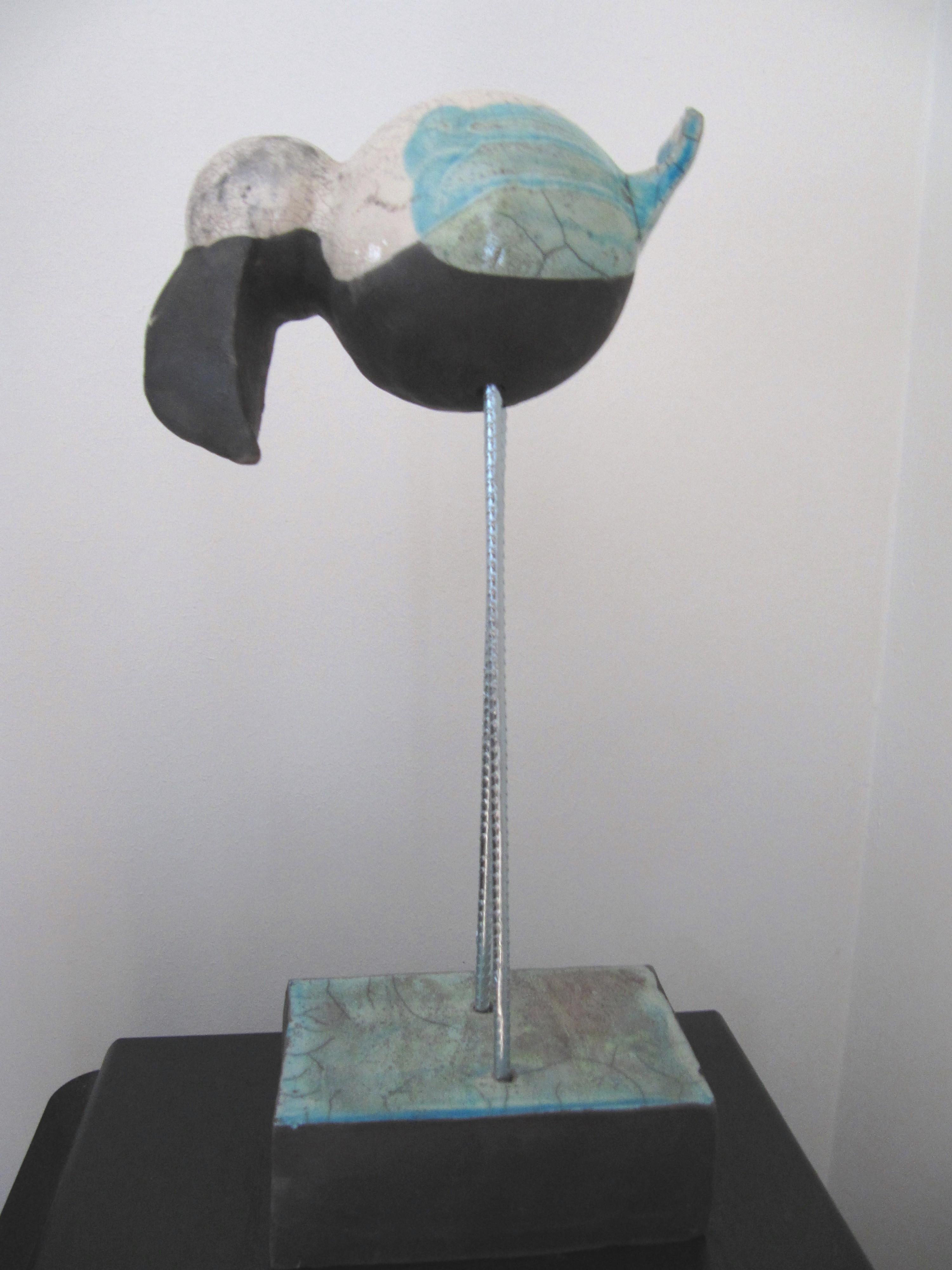 Toekan, raku gestookt, meerkleurig op keramiek sokkel. Kan allen in combinatie met Toekan, rakugestookt 2 wprden gekocht.