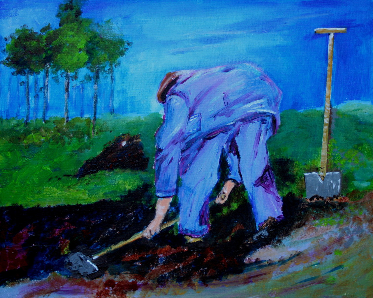 In het open veld en spittend aan het werk.