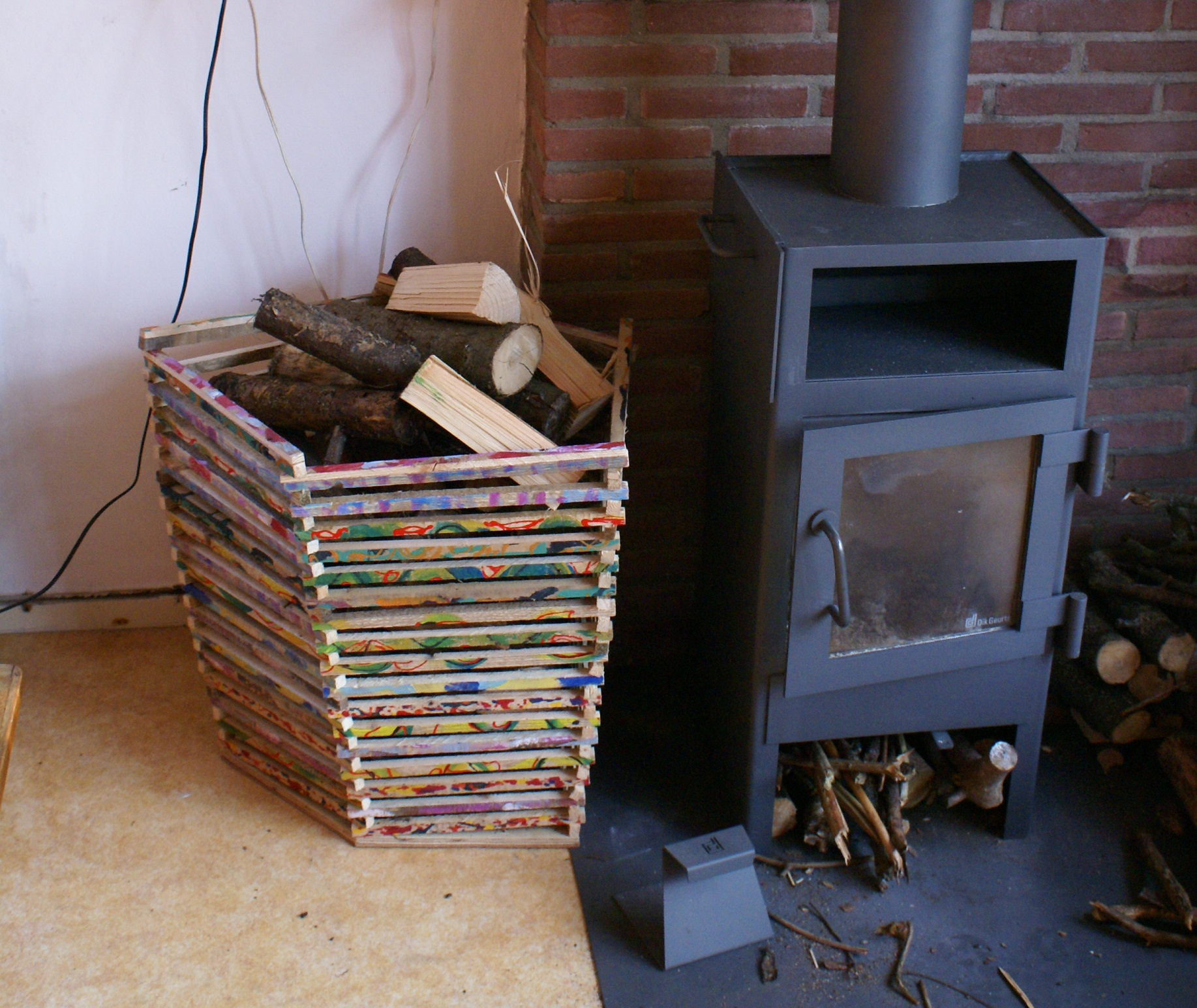 Houtmand is gemaakt van dunne stroken frisgekleurd pallethout. Door de manier van stapelen is er een ruimtelijk effect ontstaan. De vorm is asymmetrisch.