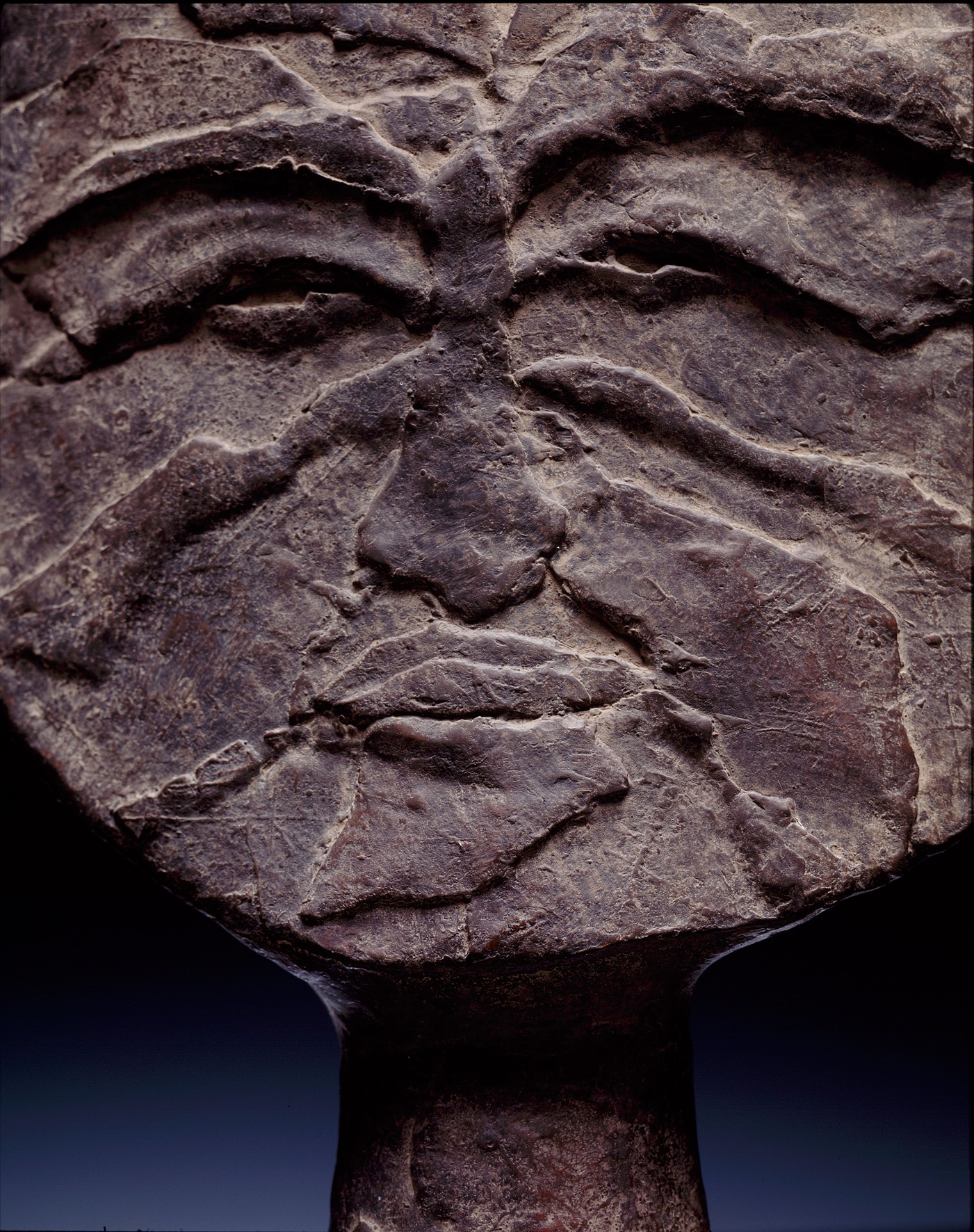 Serie koppen; kop en face De tekening die er in zit wordt bereikt door minimaal aan te geven waar ogen, neus en mond zitten. Door lichtinval en schaduw verandert de uitdrukking