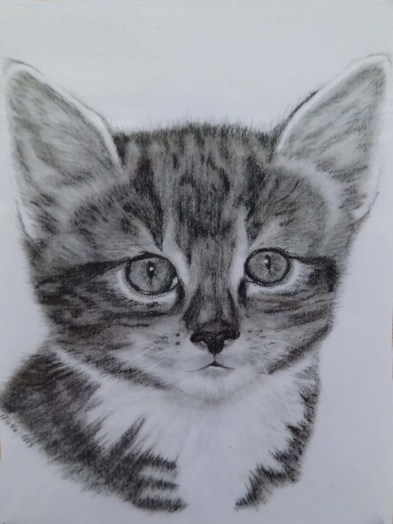 Jong en speels poesje getekend naar een foto genomen door Matty Geschiere.