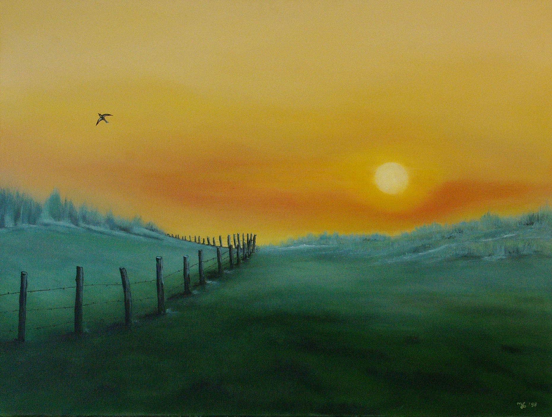 Zonsondergang; zo vrij zijn als een vogel. incl. lijst